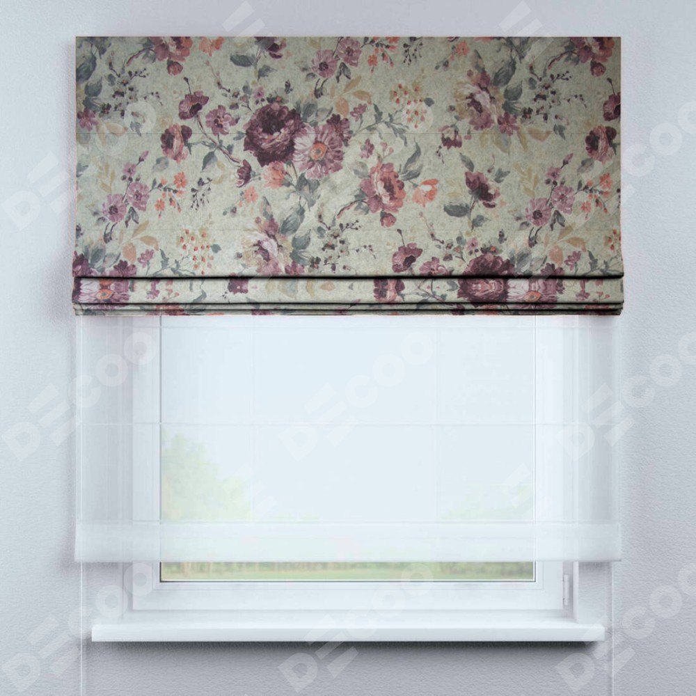 Римская штора день-ночь производителя «Cortin», используется для проёма, пошита из двух полотен, с лицевой стороны «Пионы», вторая ткань тюль (по стандарту комплектуется тюль белого цвета артикул V-01). Имеет универсальный механизм и подходит для монтажа: на потолок, на стену и в нишу.