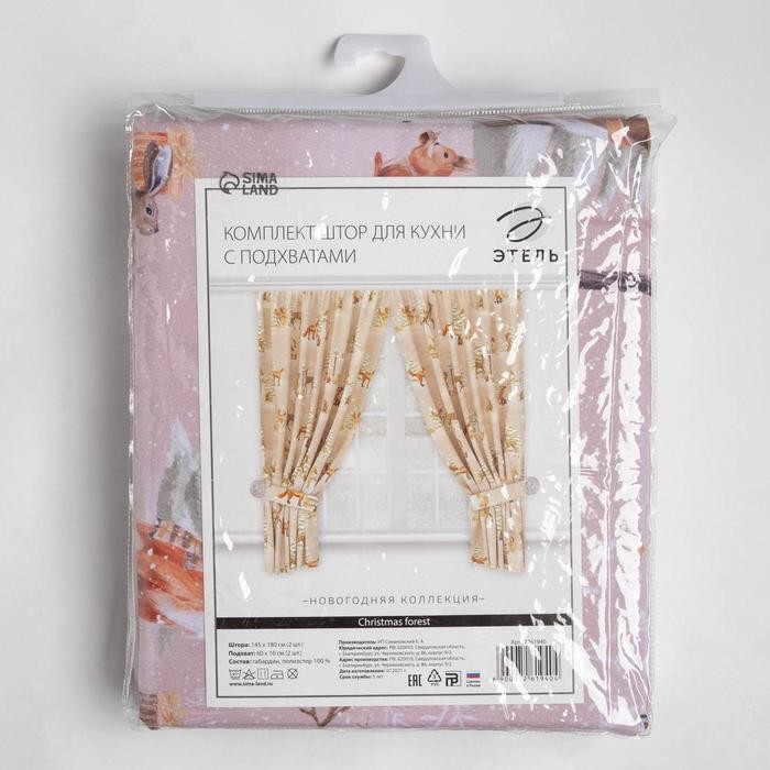 Новогодний комплект штор для кухни с подхватами «Christmas forest» 145х180см-2 шт, габардин