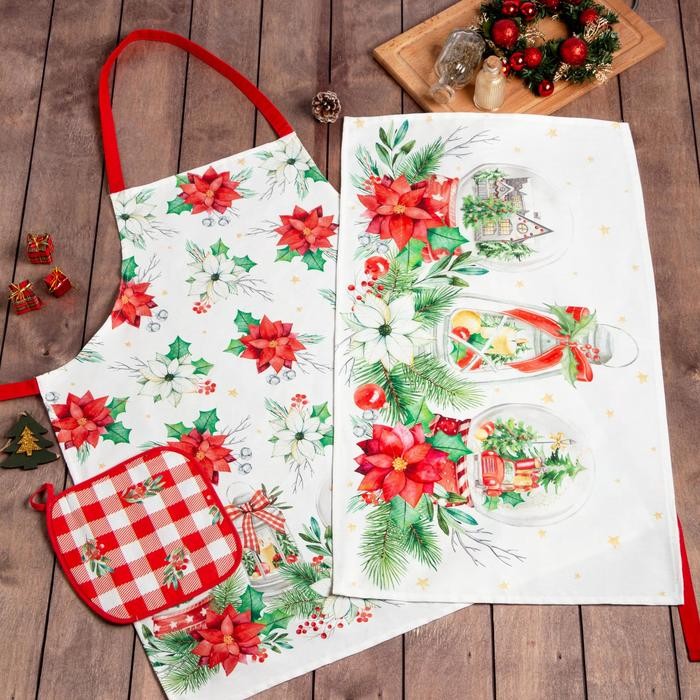 Набор подарочный «Этель» Christmas red flowers, фартук, полотенце, прихватка