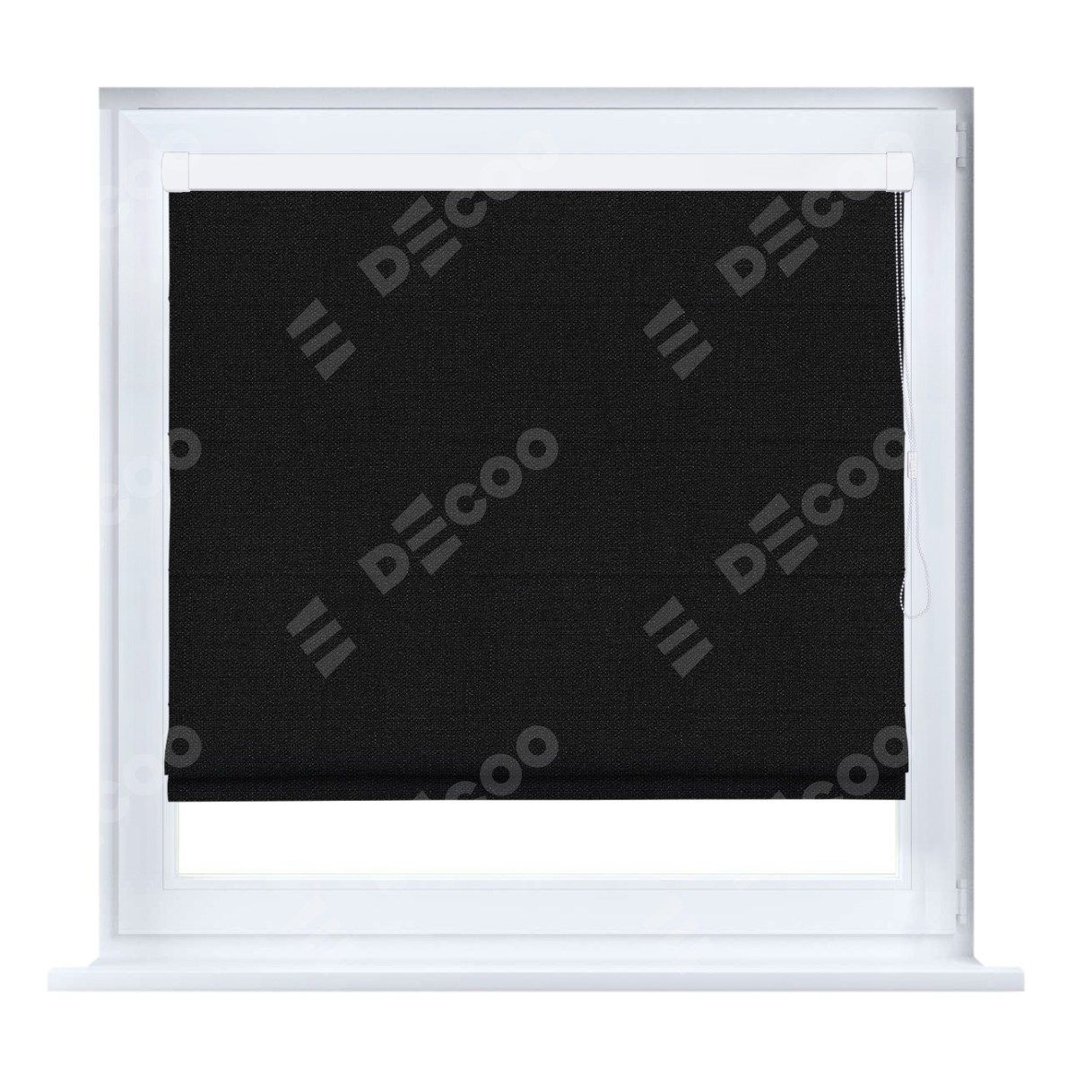 Римская штора кассетного типа, производителя «Cortin», устанавливается только на пластиковые окна и прилегает к стеклопакету, пошита из ткани лён чёрный, артикул 85927.