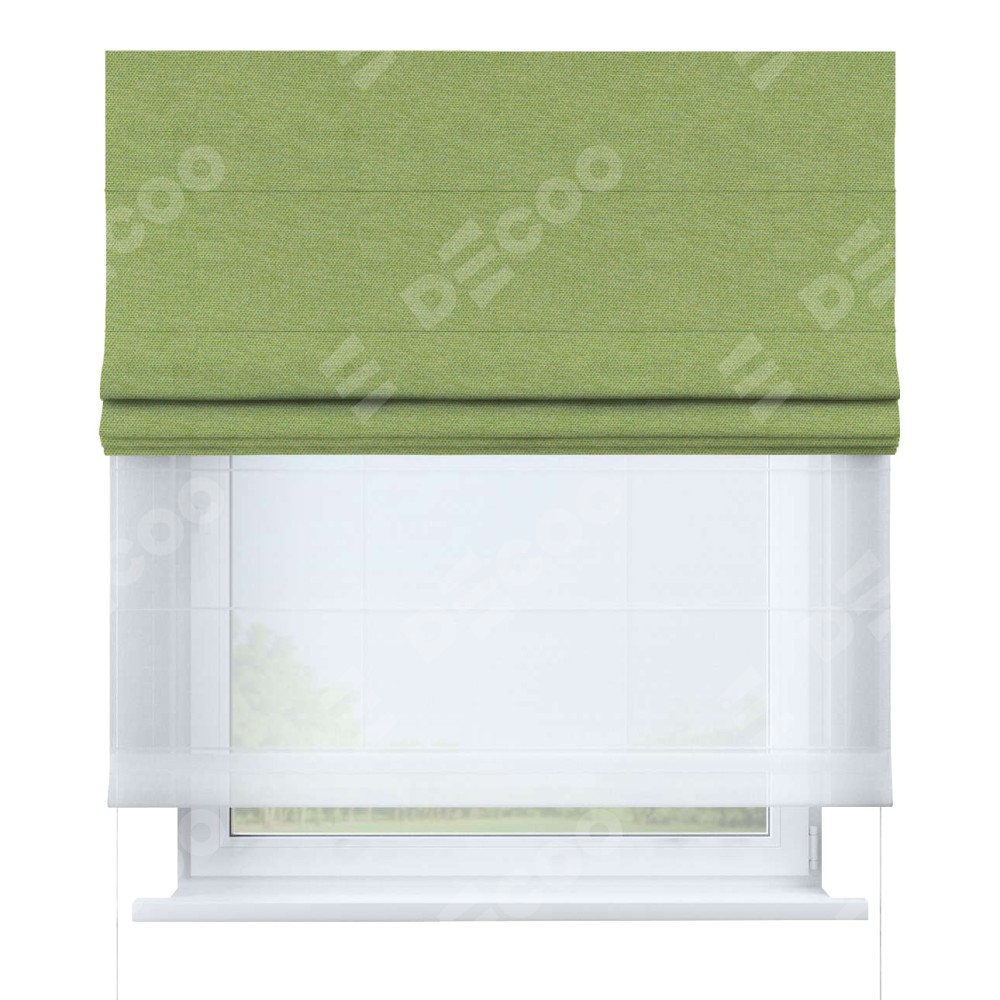 Римская штора день-ночь производителя «Cortin», используется для проёма, пошита из двух полотен, с лицевой стороны лён димаут салатовый артикул 83032, вторая ткань тюль (по стандарту комплектуется тюль белого цвета артикул V-01). Имеет универсальный механизм и подходит для монтажа: на потолок, на стену и в нишу.