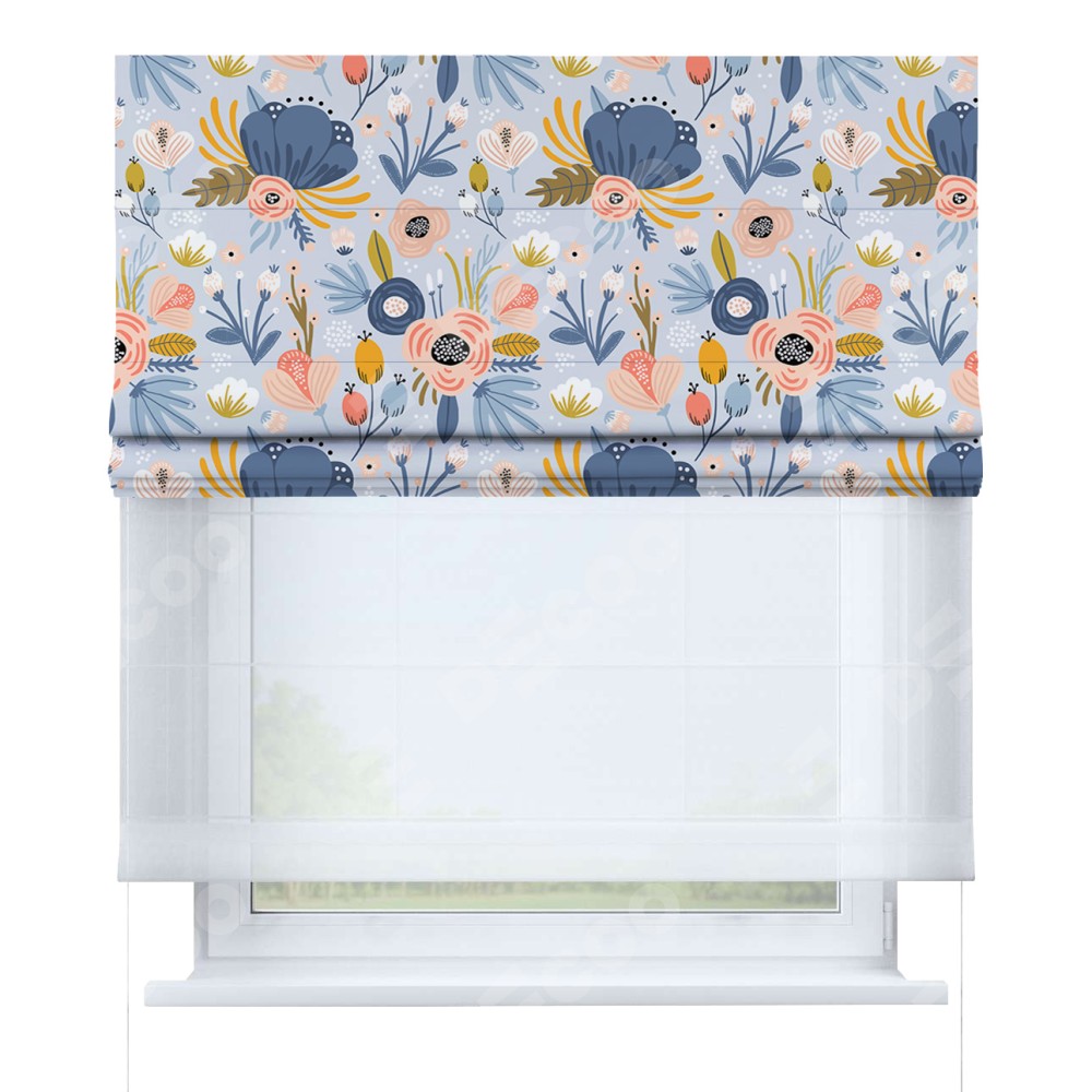 Римская штора день-ночь производителя «Cortin», используется для проёма, пошита из двух полотен, с лицевой блэкаут с нанесением сублимационной печати «Волшебные цветы», вторая ткань тюль (по стандарту комплектуется тюль белого цвета артикул V-01). Имеет универсальный механизм и подходит для монтажа: на потолок, на стену и в нишу.
