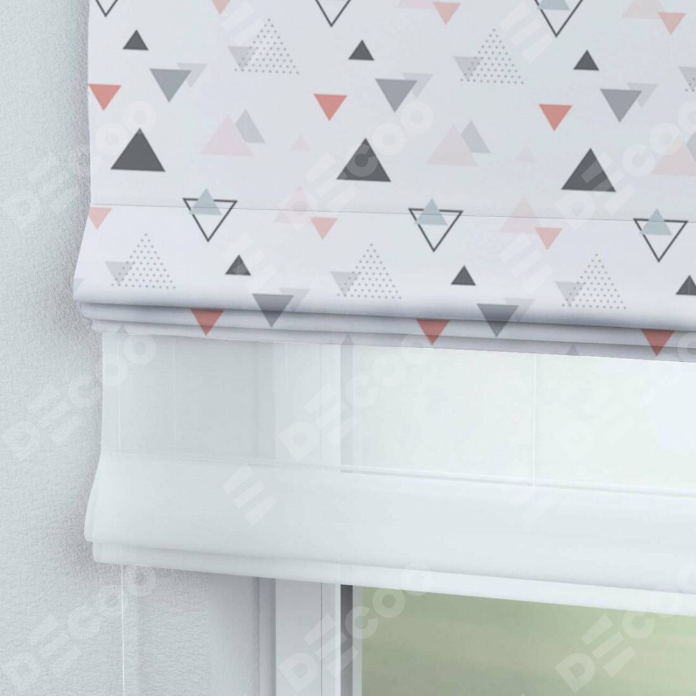 Римская штора день-ночь производителя «Cortin», используется для проёма, пошита из двух полотен, с лицевой блэкаут с нанесением сублимационной печати «Дождь из треугольников», вторая ткань тюль (по стандарту комплектуется тюль белого цвета артикул V-01). Имеет универсальный механизм и подходит для монтажа: на потолок, на стену и в нишу.