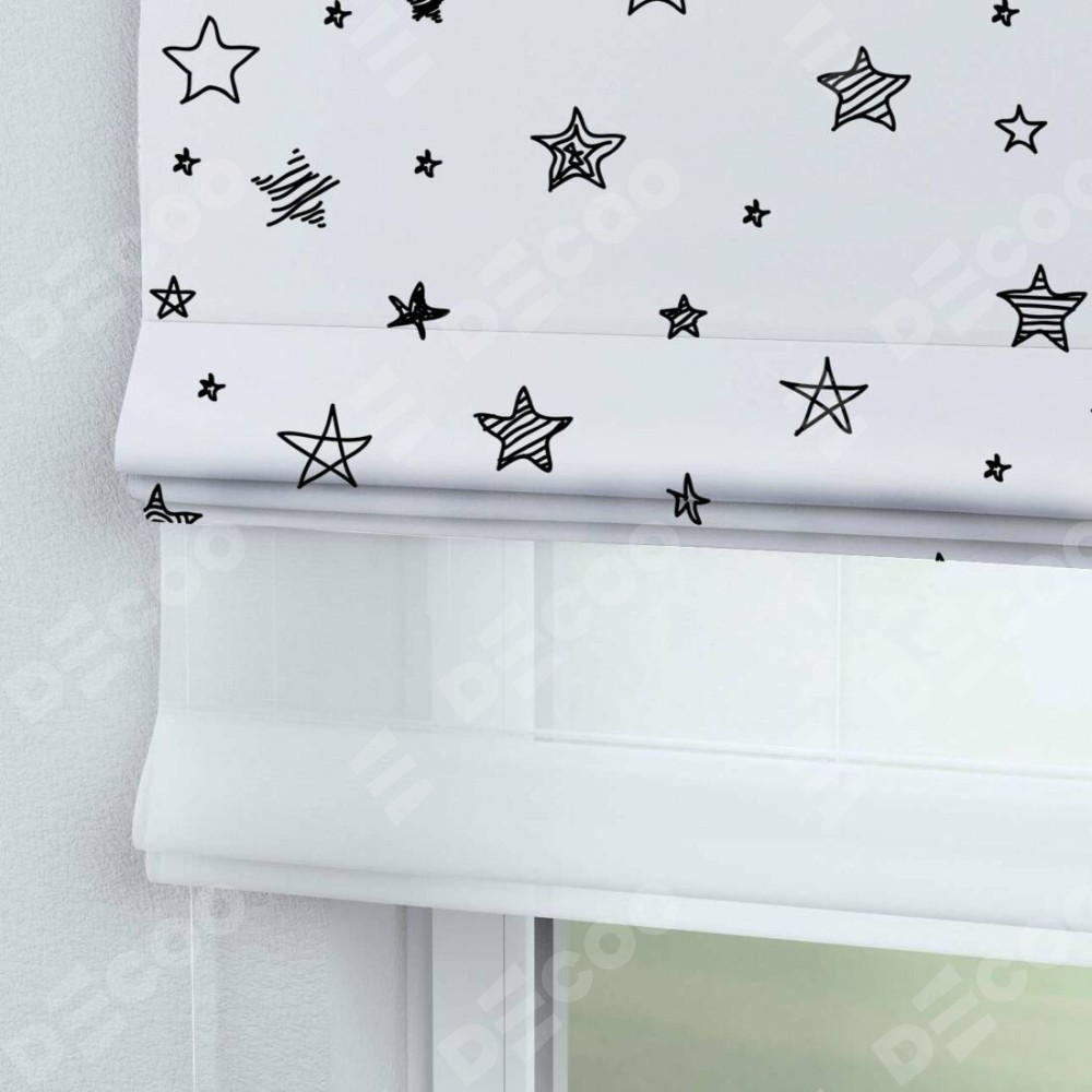 Римская штора день-ночь производителя «Cortin», используется для проёма, пошита из двух полотен, с лицевой блэкаут с нанесением сублимационной печати «Звёзды», вторая ткань тюль (по стандарту комплектуется тюль белого цвета артикул V-01). Имеет универсальный механизм и подходит для монтажа: на потолок, на стену и в нишу.