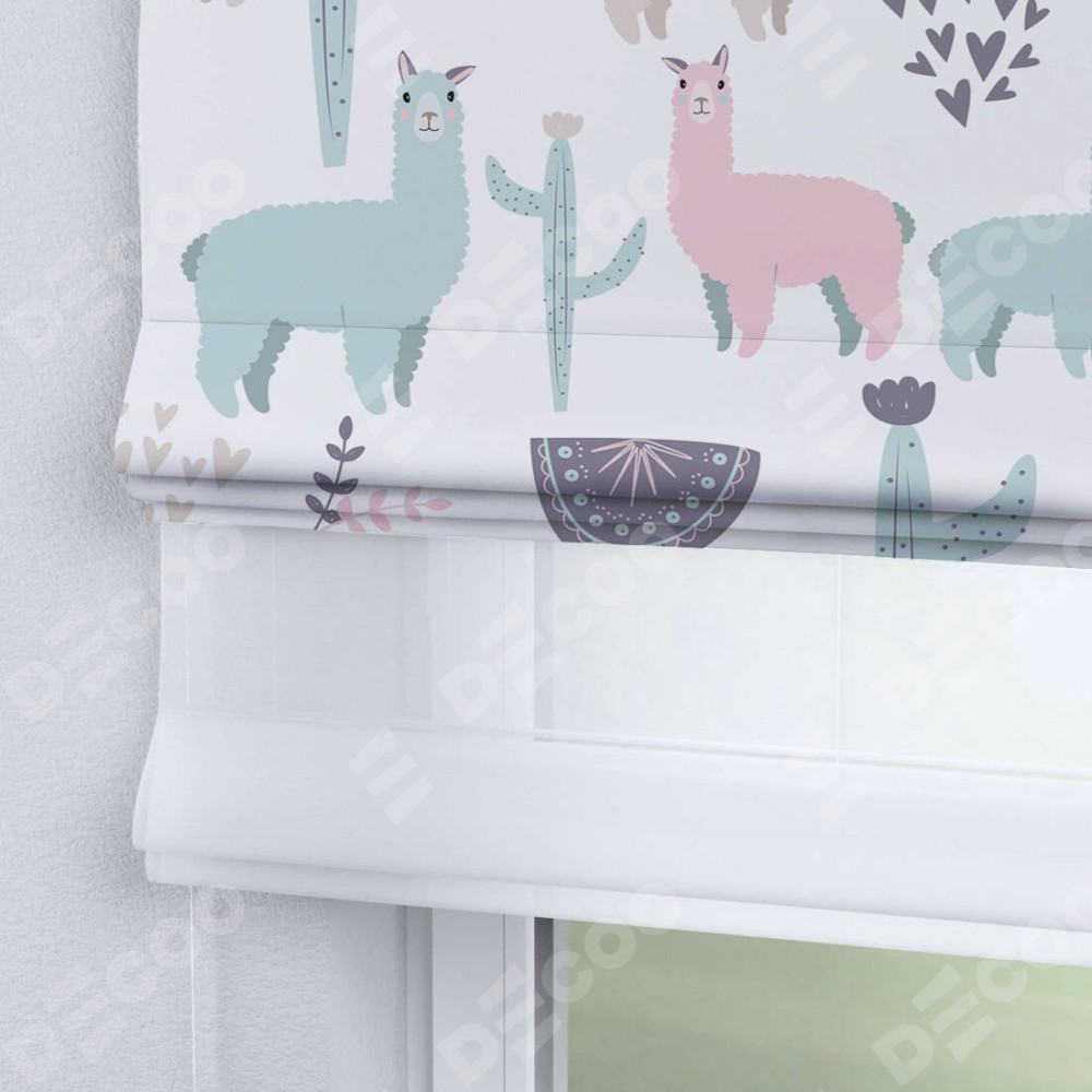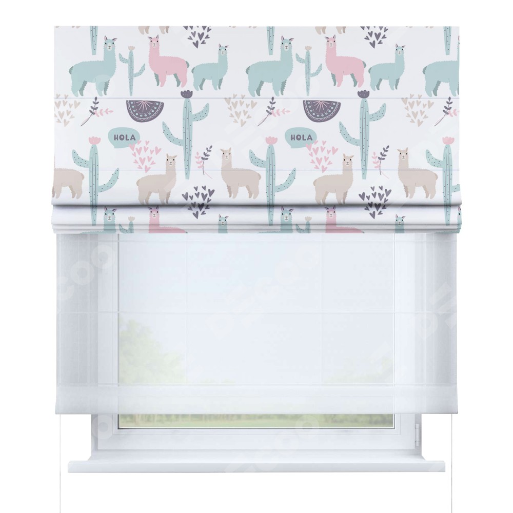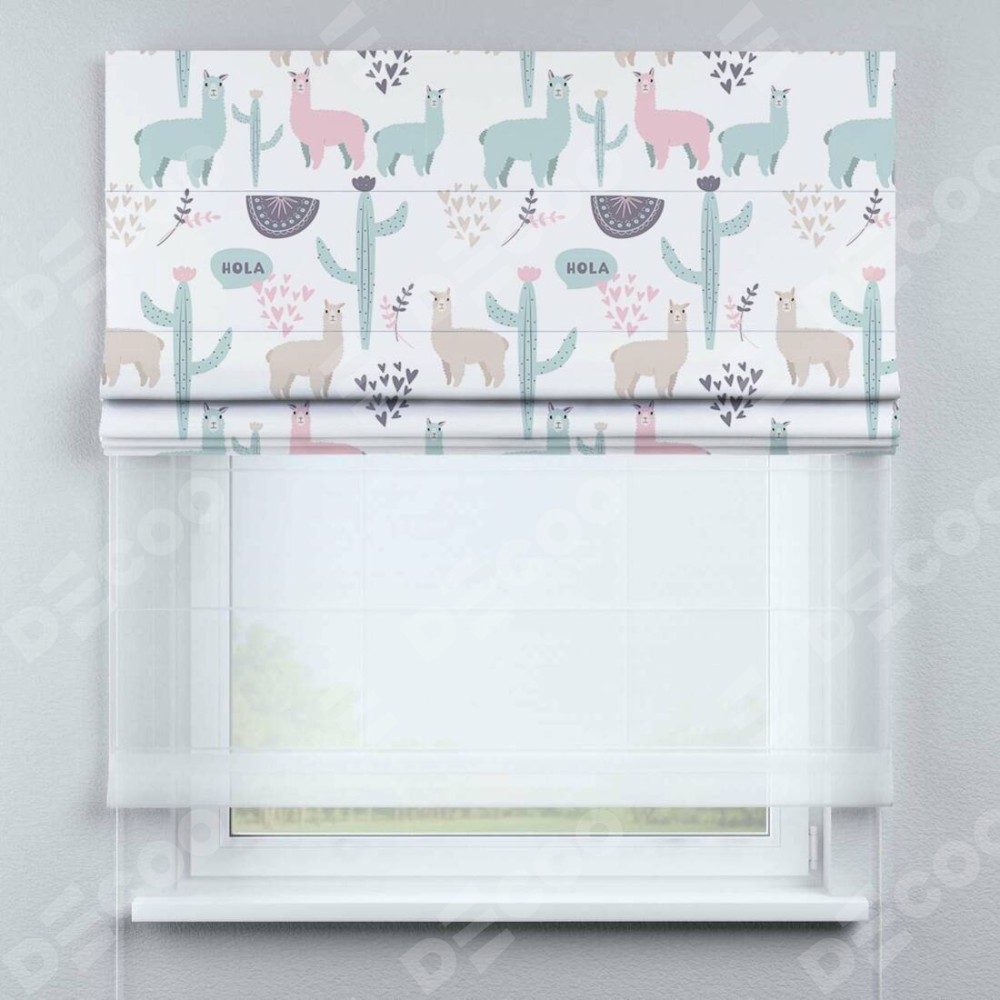 Римская штора день-ночь производителя «Cortin», используется для проёма, пошита из двух полотен, с лицевой блэкаут с нанесением сублимационной печати «Милый лама», вторая ткань тюль (по стандарту комплектуется тюль белого цвета артикул V-01). Имеет универсальный механизм и подходит для монтажа: на потолок, на стену и в нишу.