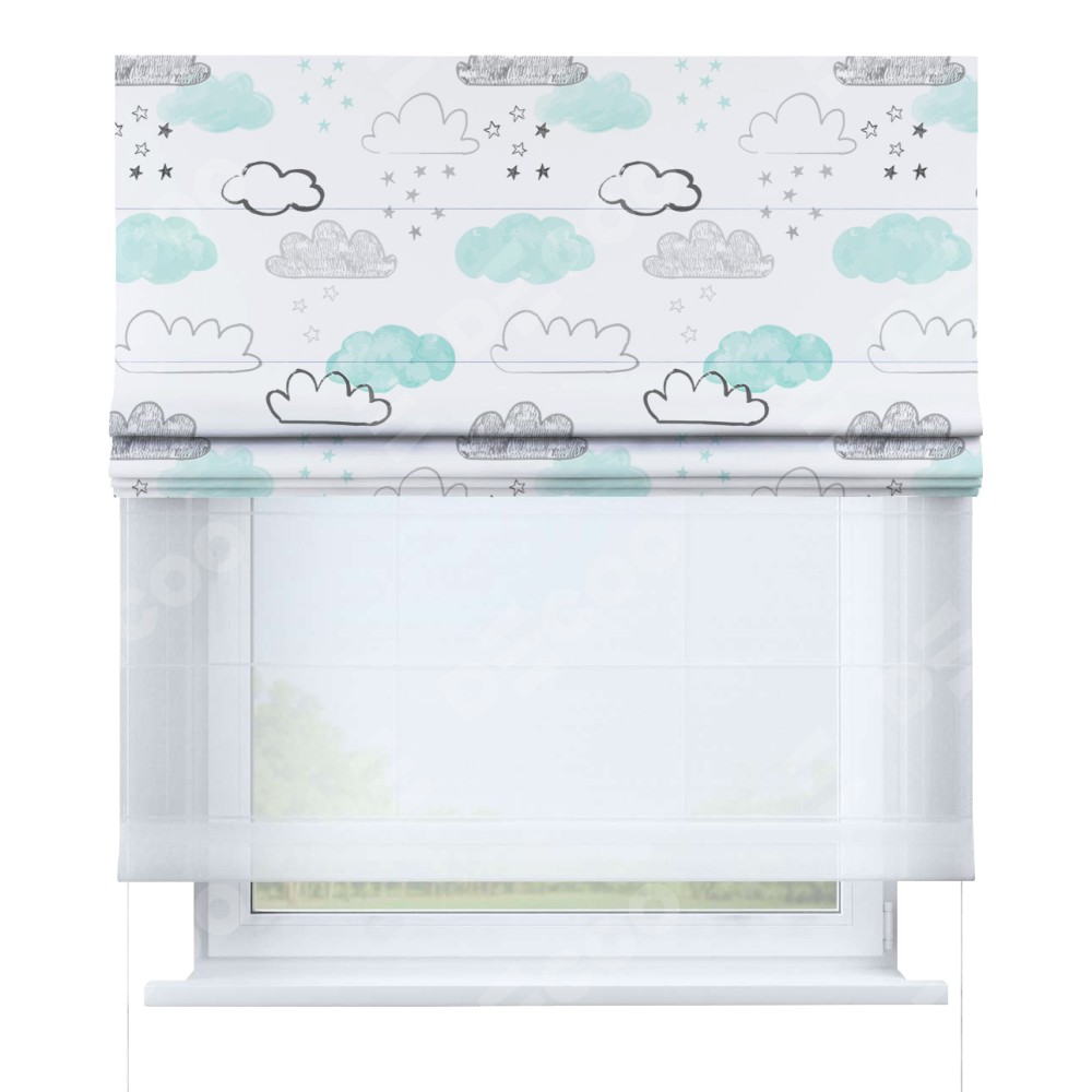 Римская штора день-ночь производителя «Cortin», используется для проёма, пошита из двух полотен, с лицевой блэкаут с нанесением сублимационной печати «Облака и звёзды», вторая ткань тюль (по стандарту комплектуется тюль белого цвета артикул V-01). Имеет универсальный механизм и подходит для монтажа: на потолок, на стену и в нишу.