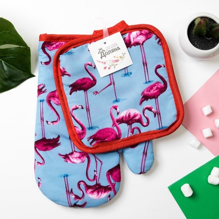 Кухонный набор (2 предмета) Доляна «Фламинго», цвет голубой, прихватка 16×16 см, рукавица 26×16 см, 100% п/э