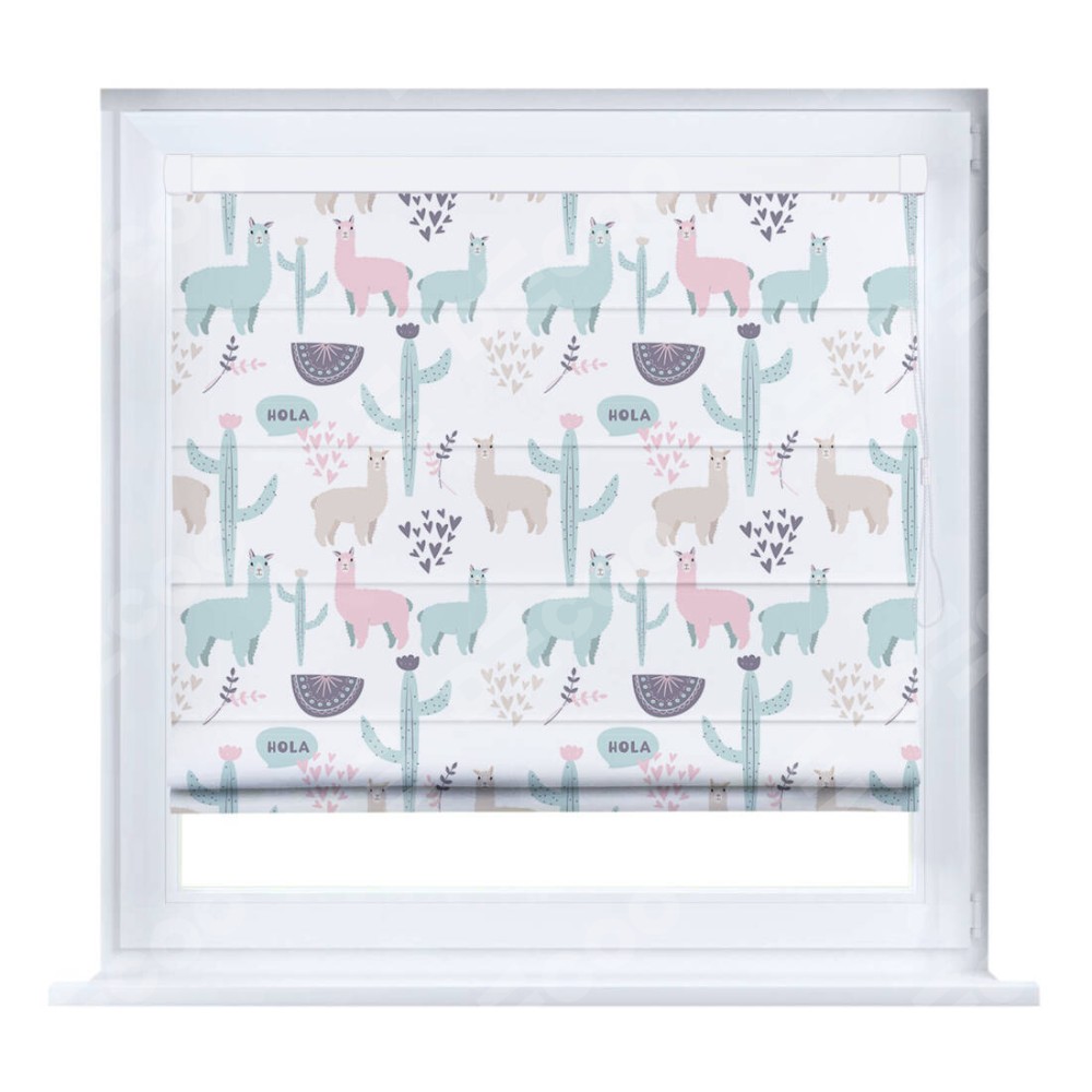 Римская штора производителя «Cortin», устанавливается на створку окна, пошита из ткани блэкаут с нанесением сублимационной печати «Милый лама». Штора шьётся по индивидуальным размерам, для данного типа римской шторы возможная ширина от 35 до 150 см., высота до 250 см.