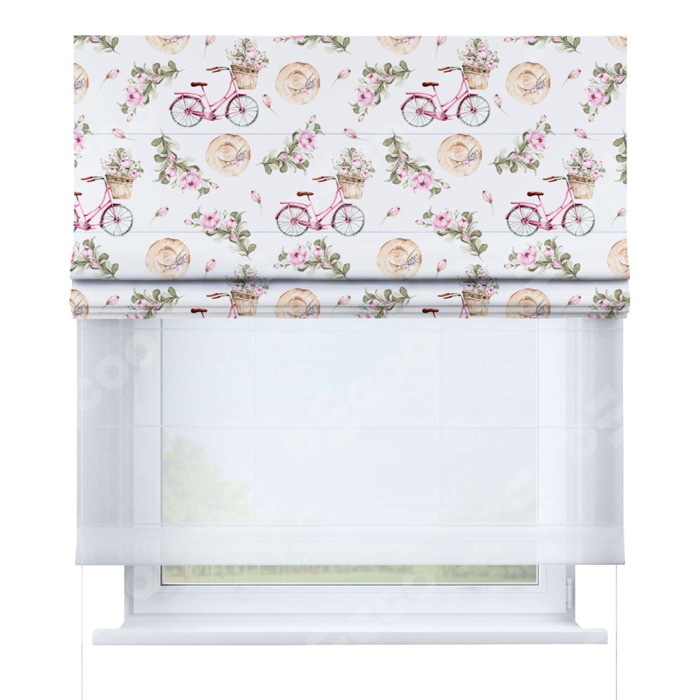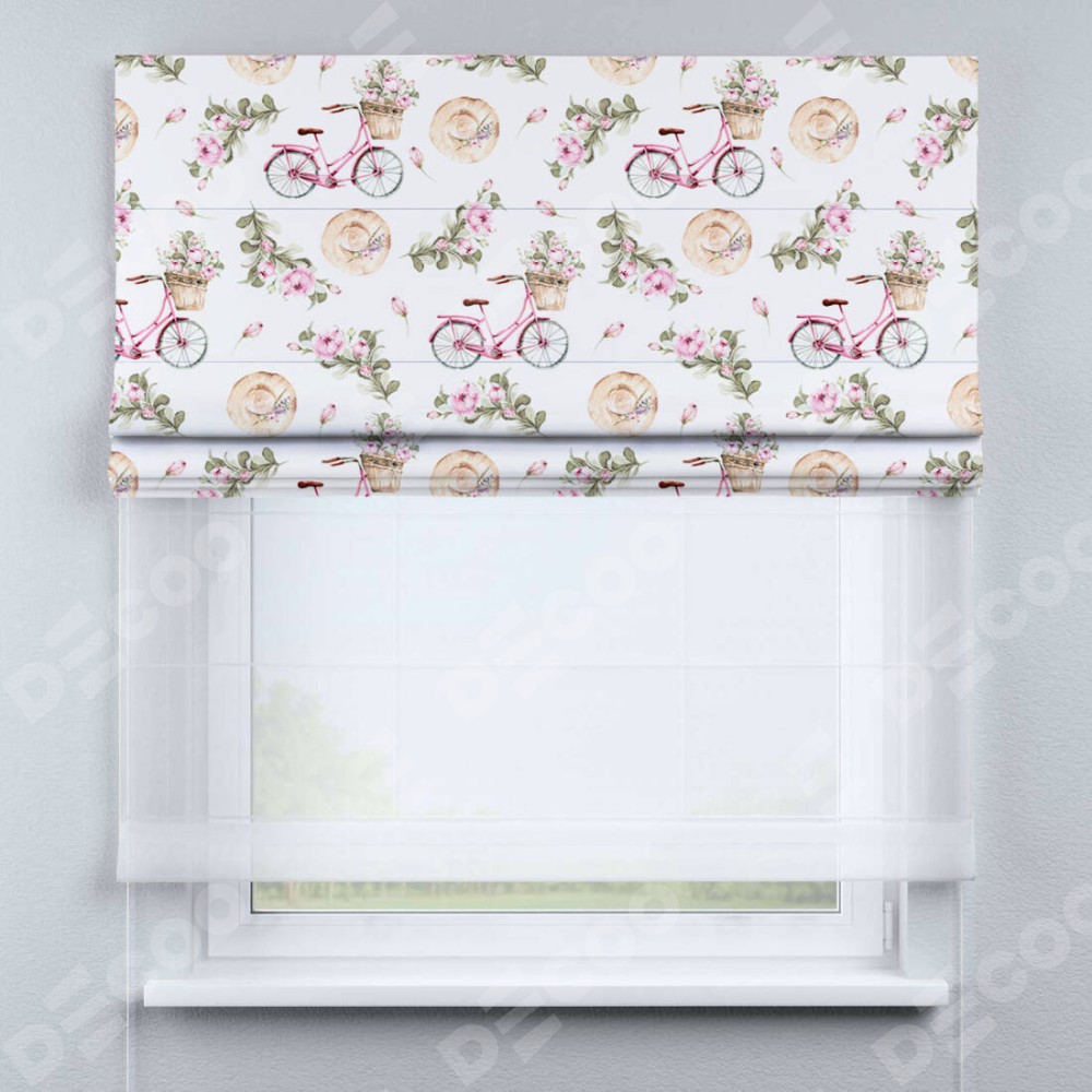 Римская штора день-ночь производителя «Cortin», используется для проёма, пошита из двух полотен, с лицевой блэкаут с нанесением сублимационной печати «Розовый велосипед», вторая ткань тюль (по стандарту комплектуется тюль белого цвета артикул V-01). Имеет универсальный механизм и подходит для монтажа: на потолок, на стену и в нишу.