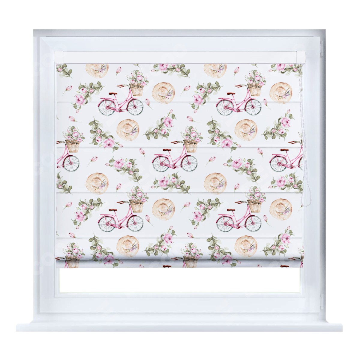 Римская штора кассетного типа, производителя «Cortin», устанавливается только на пластиковые окна и прилегает к стеклопакету, пошита из ткани блэкаут с нанесением сублимационной печати «Розовый велосипед».