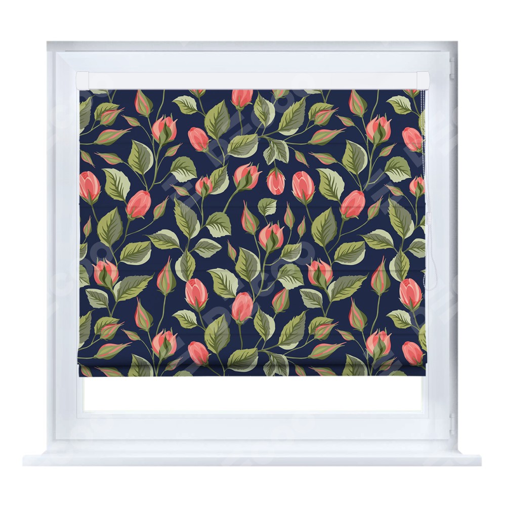 Римская штора кассетного типа, производителя «Cortin», устанавливается только на пластиковые окна и прилегает к стеклопакету, пошита из ткани блэкаут с нанесением сублимационной печати «Красная роза».