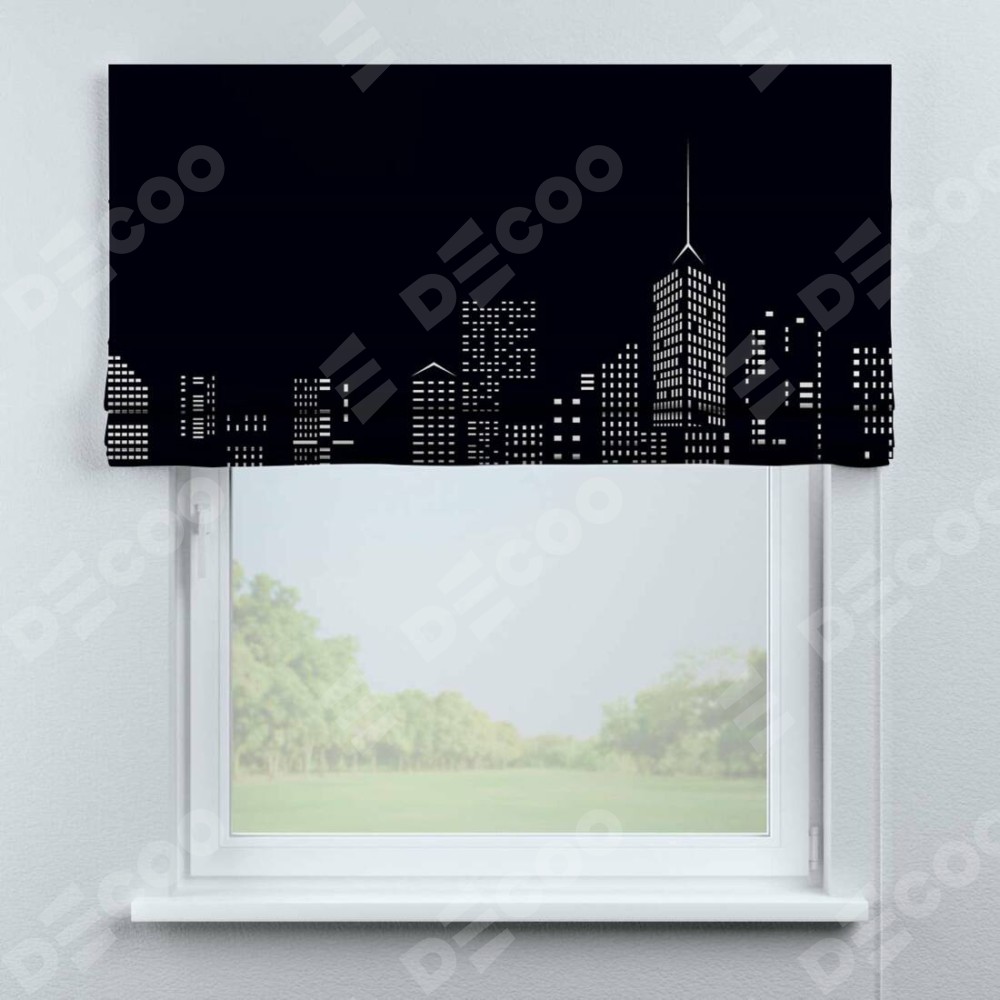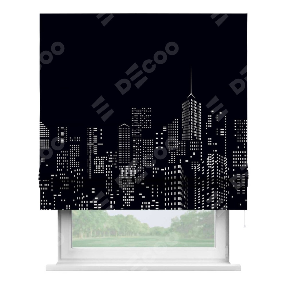 Римская штора производителя «Cortin», используется для проёма, пошита из ткани блэкаут с нанесением сублимационной печати «Ночной город». Имеет универсальный механизм и подходит для монтажа: на потолок, на стену и в нишу.