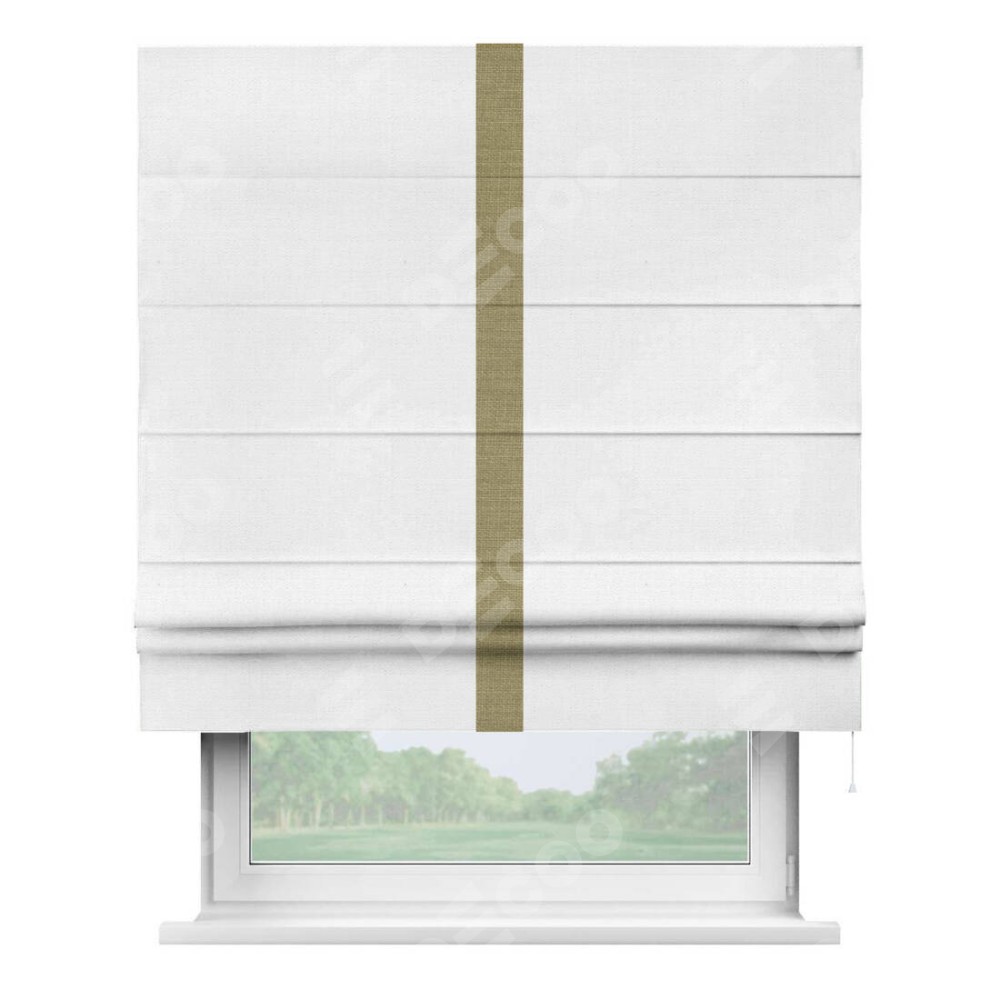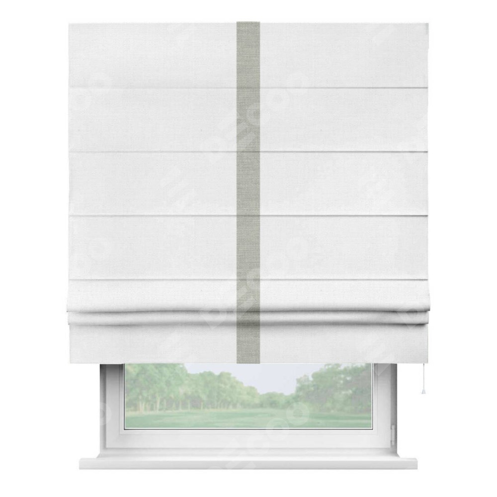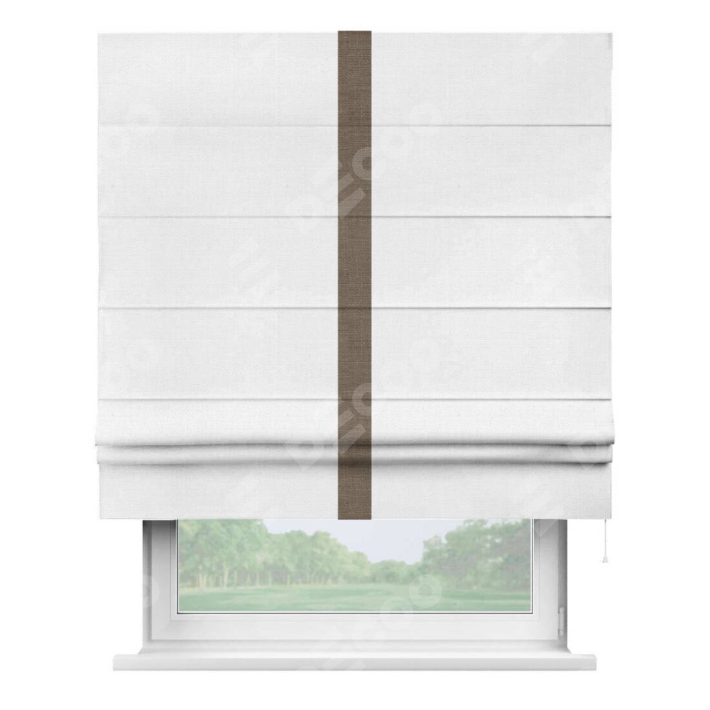 Римская штора производителя «Cortin», используется для проёма, пошита из ткани лён белый, артикул 53430. Отделка шторы кантом «Хайвэй», ткань для канта используется из льна разной расцветки на выбор. Имеет универсальный механизм и подходит для монтажа: на потолок, на стену и в нишу.