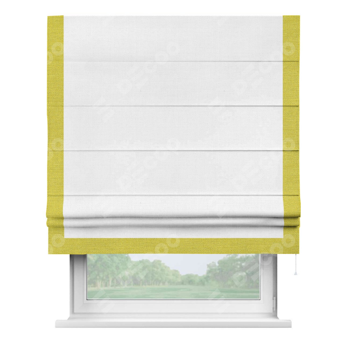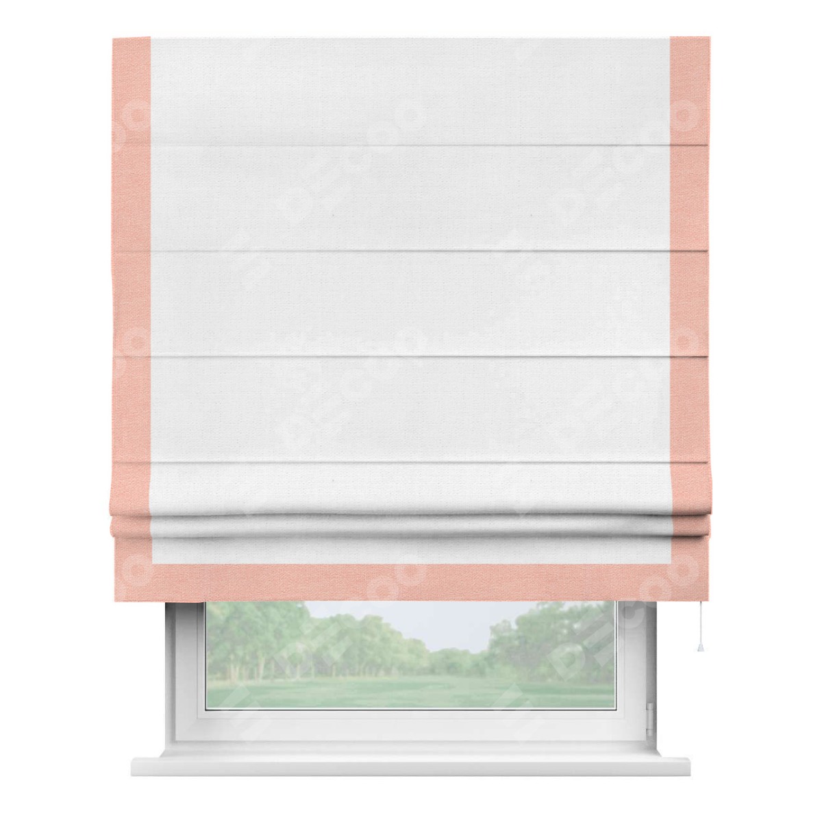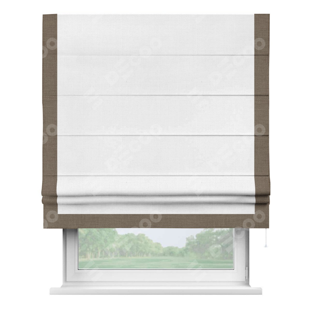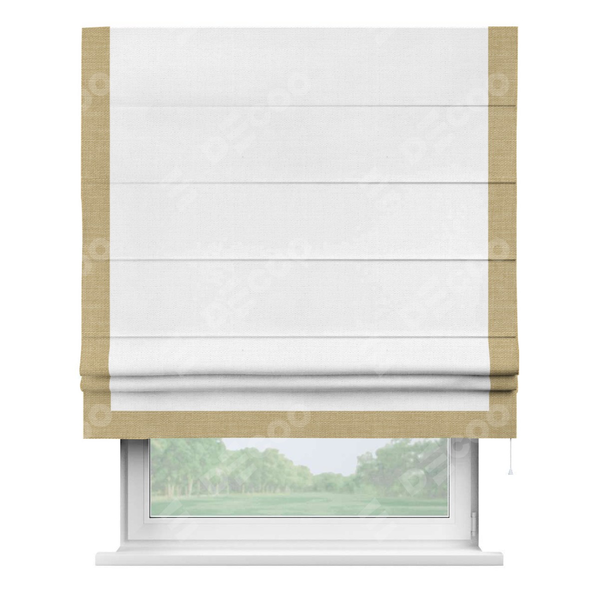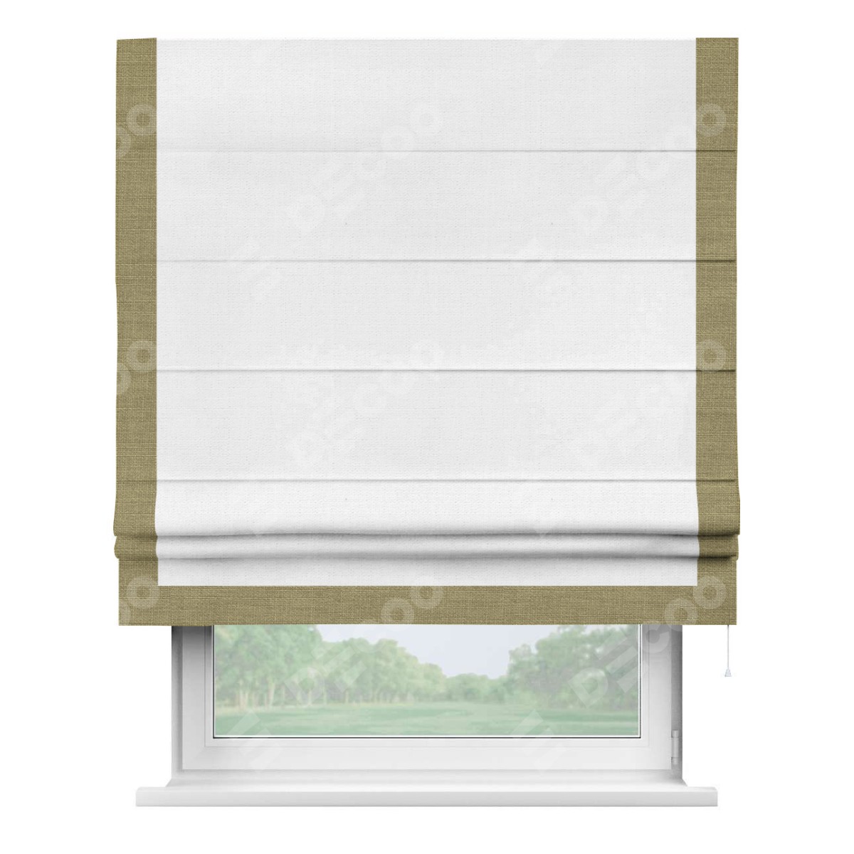 Римская штора производителя «Cortin», используется для проёма, пошита из ткани лён белый, артикул 53430. Отделка шторы кантом «Виктория», ткань для канта используется из льна разной расцветки на выбор. Имеет универсальный механизм и подходит для монтажа: на потолок, на стену и в нишу.