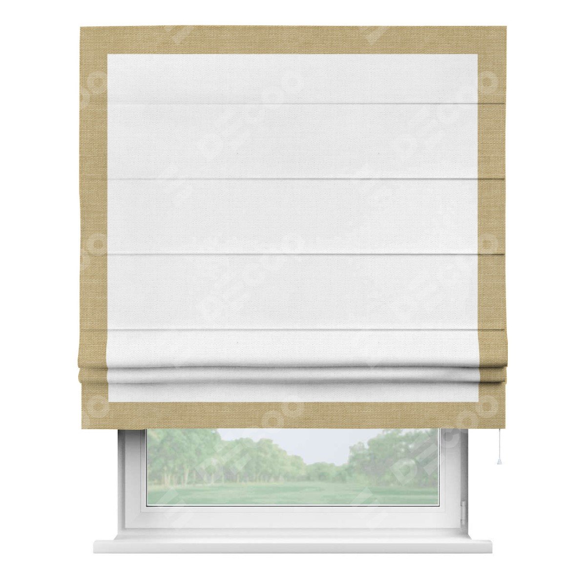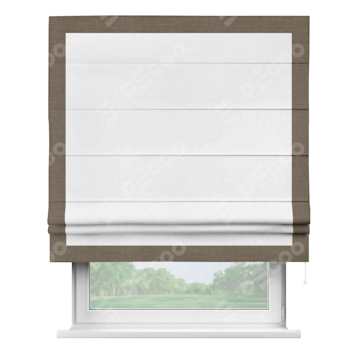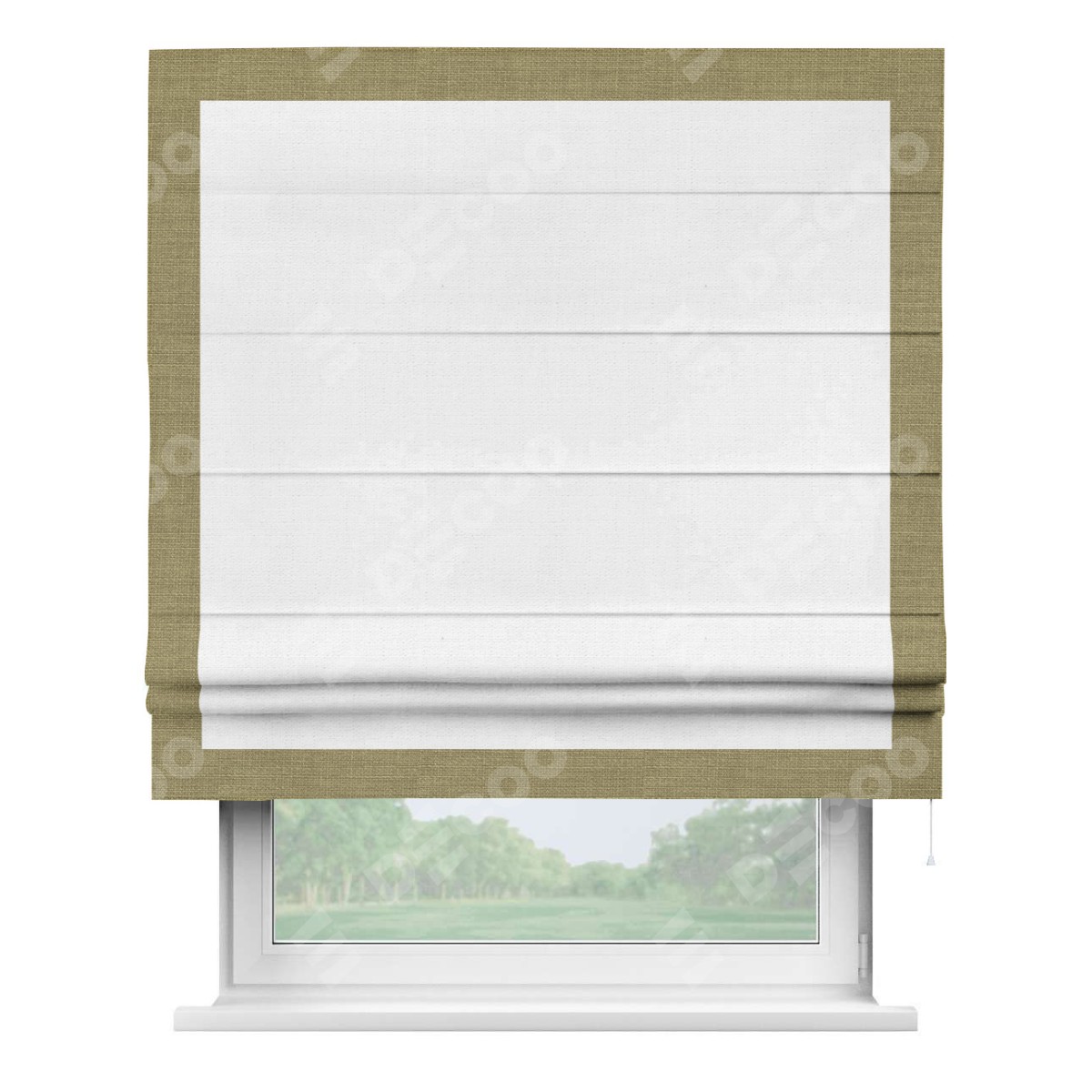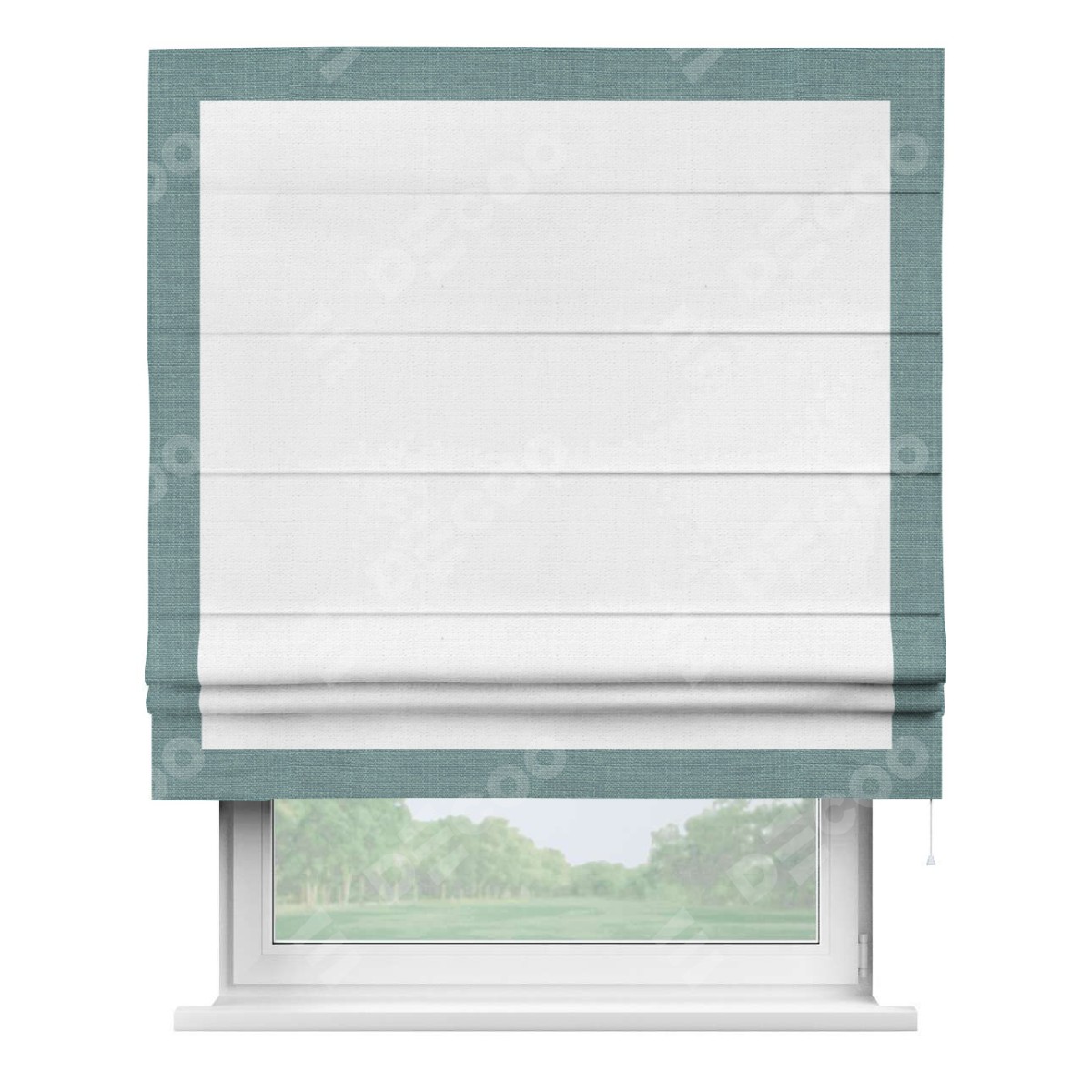 Римская штора производителя «Cortin», используется для проёма, пошита из ткани лён белый, артикул 53430. Отделка шторы кантом «Чесс», ткань для канта используется из льна разной расцветки на выбор. Имеет универсальный механизм и подходит для монтажа: на потолок, на стену и в нишу.