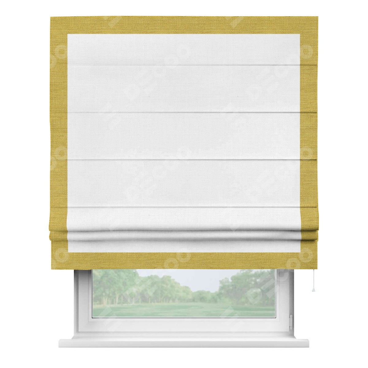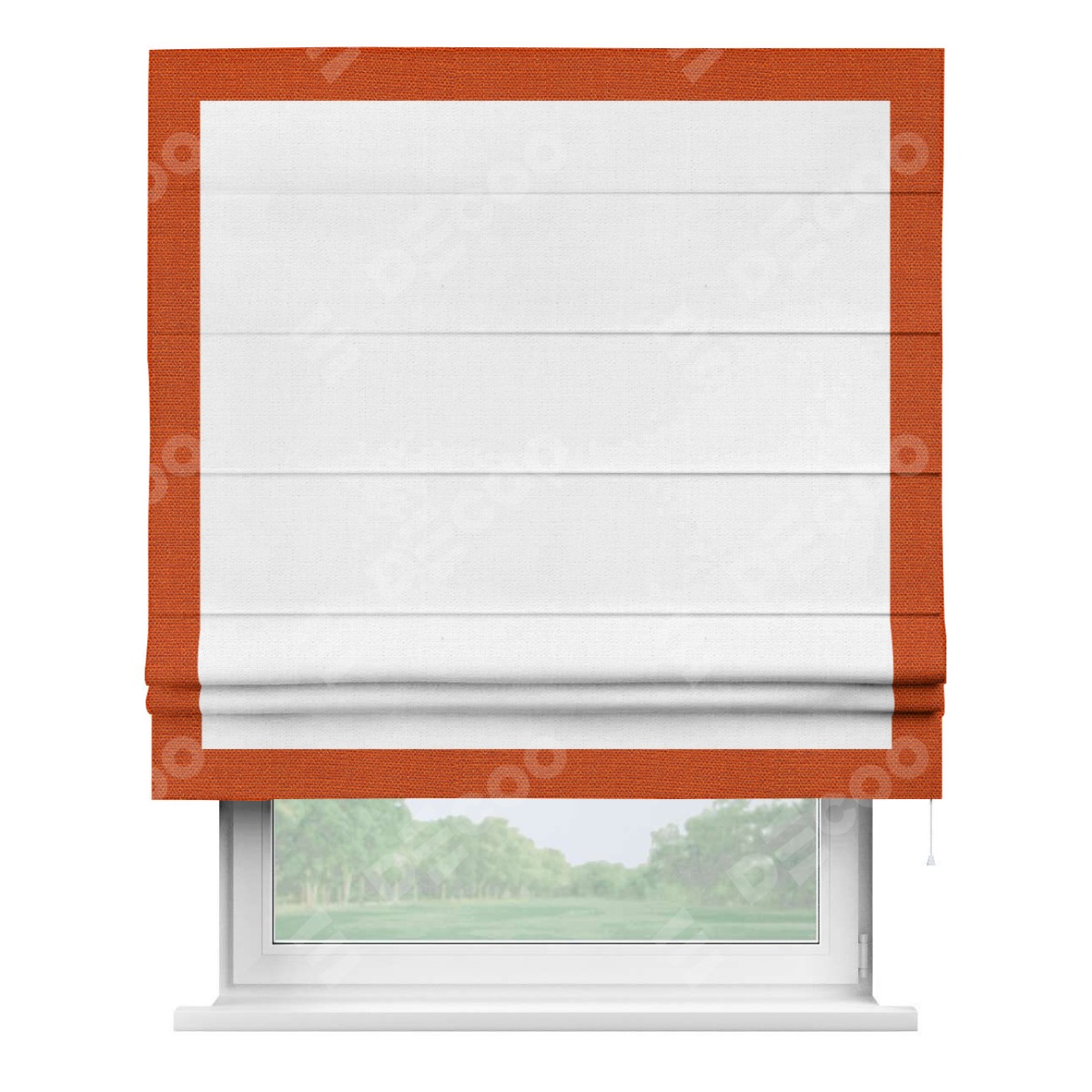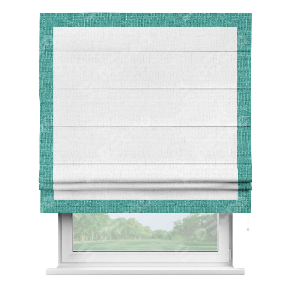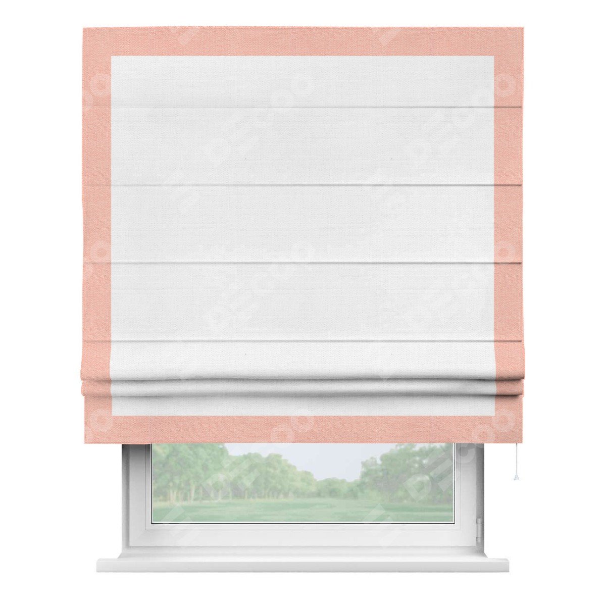 Римская штора производителя «Cortin», используется для проёма, пошита из ткани лён белый, артикул 53430. Отделка шторы кантом «Чесс», ткань для канта используется из льна разной расцветки на выбор. Имеет универсальный механизм и подходит для монтажа: на потолок, на стену и в нишу.