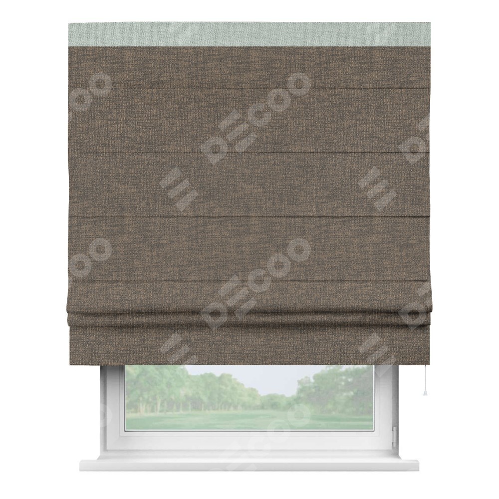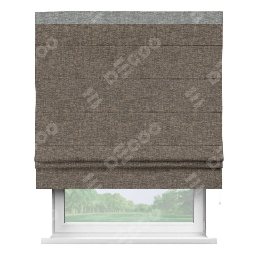 Римская штора производителя «Cortin», используется для проёма, пошита из ткани рогожка димаут коричневый, артикул 80420. Отделка шторы кантом «Кинг», ткань для канта используется из рогожки димаут разной расцветки на выбор. Имеет универсальный механизм и подходит для монтажа: на потолок, на стену и в нишу.