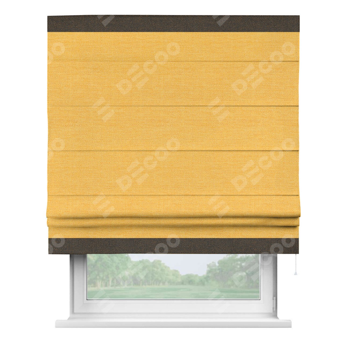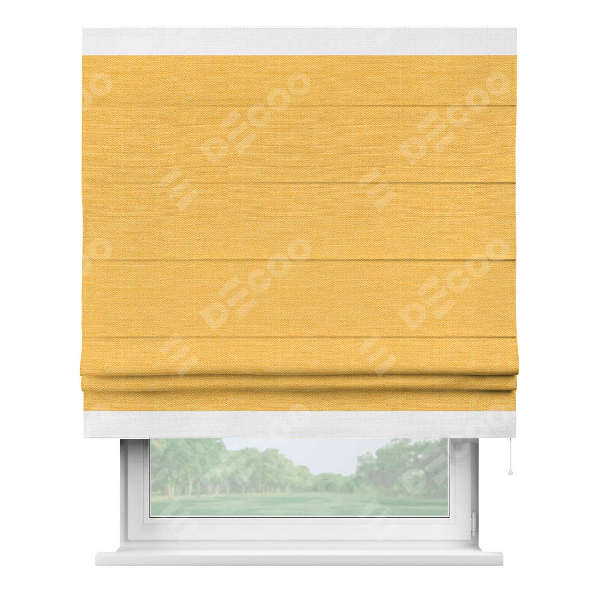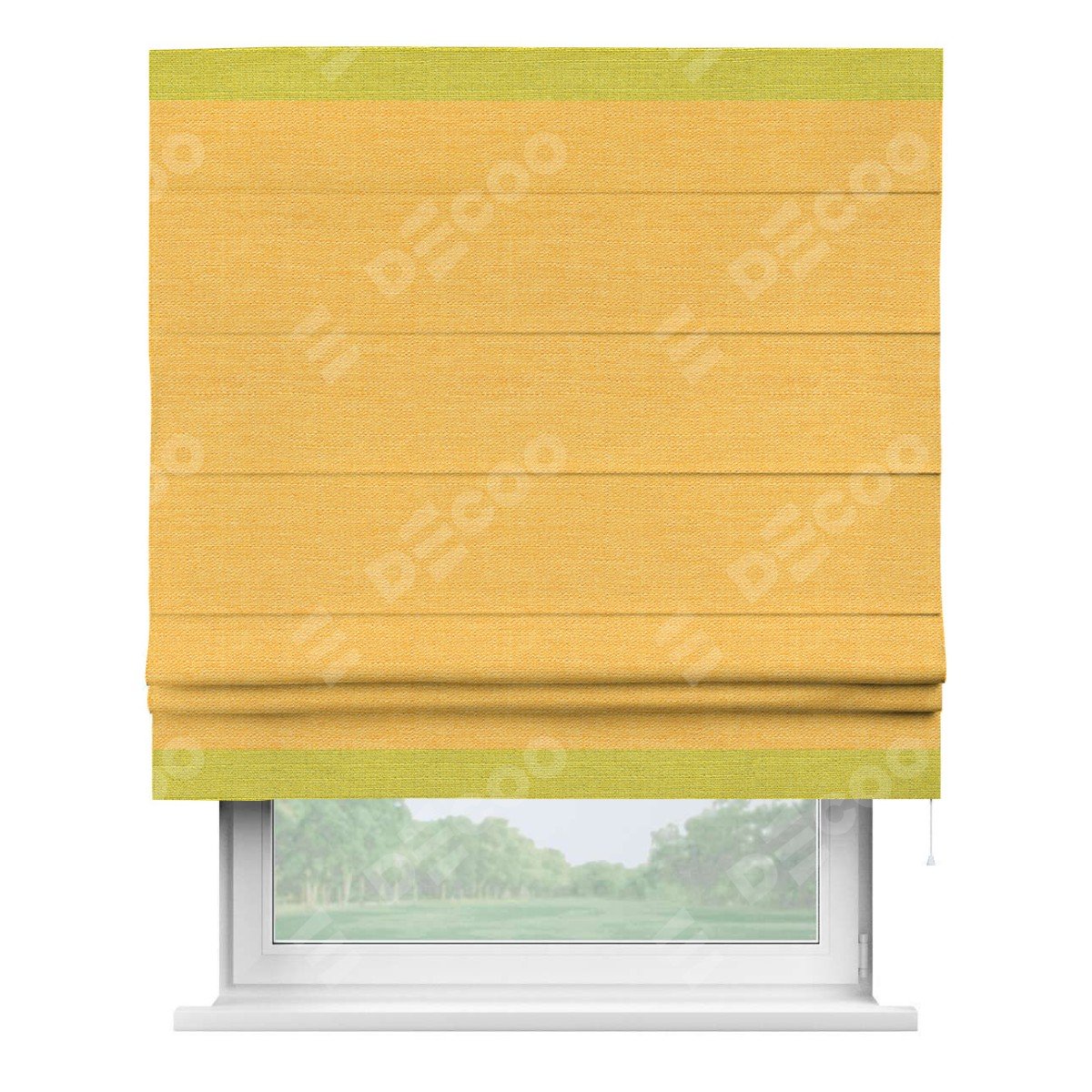 Римская штора производителя «Cortin», используется для проёма, пошита из ткани лён желтый, артикул 63738. Отделка шторы кантом «Горизонт», ткань для канта используется из льна разной расцветки на выбор. Имеет универсальный механизм и подходит для монтажа: на потолок, на стену и в нишу.