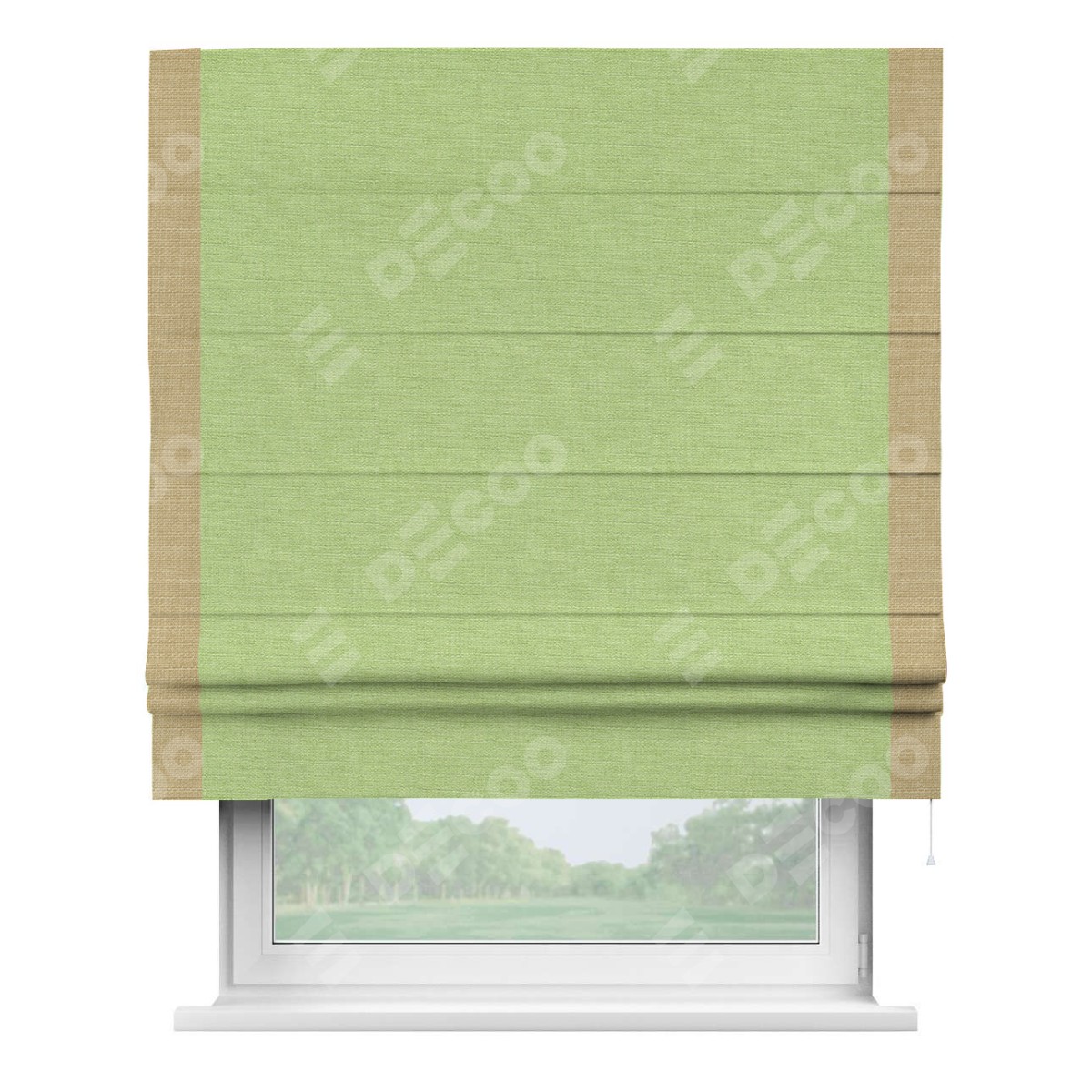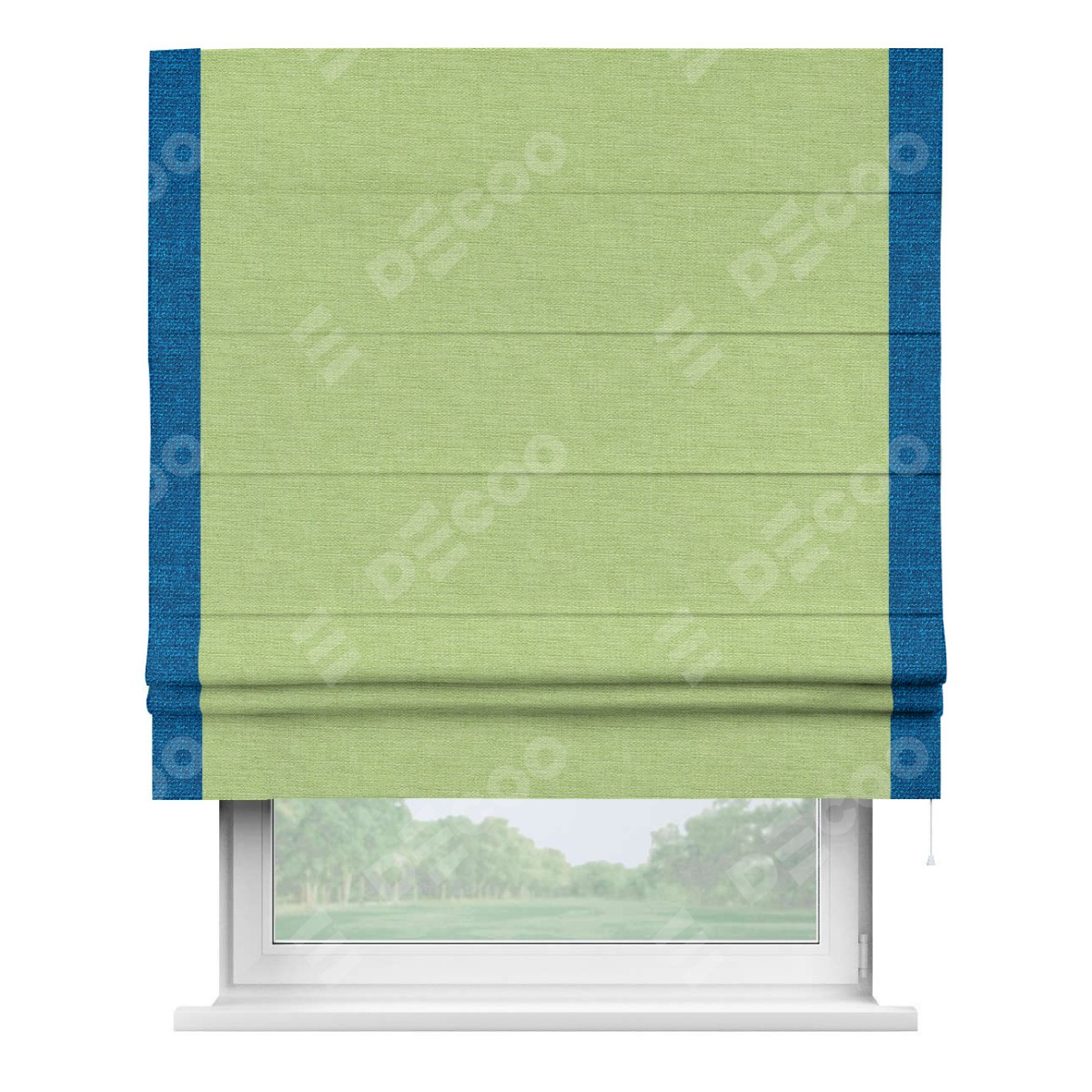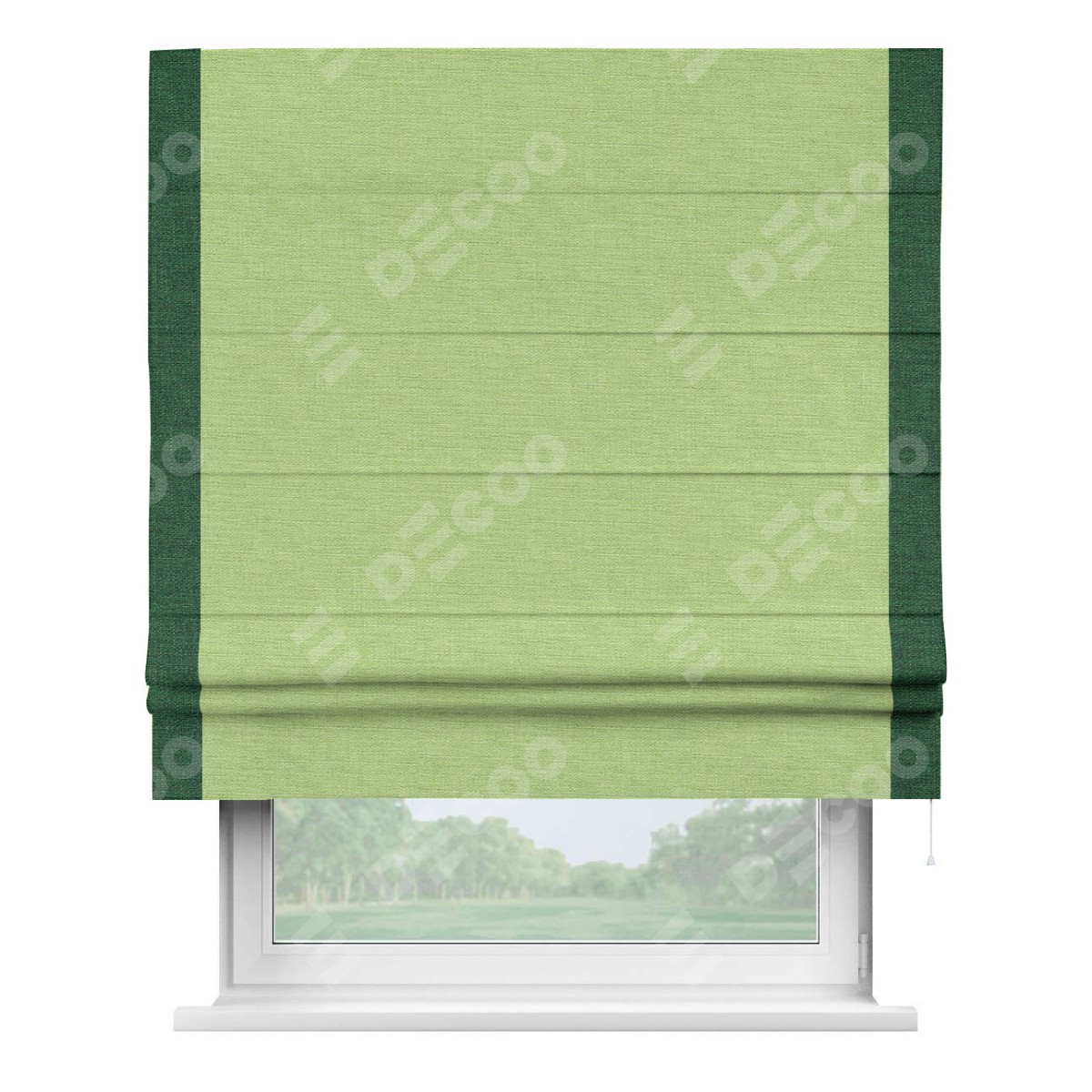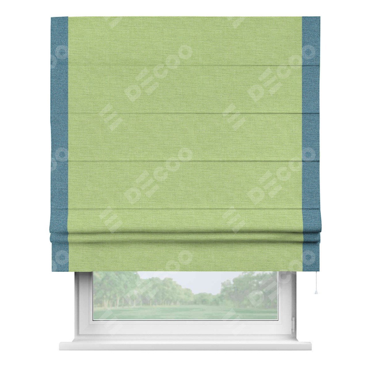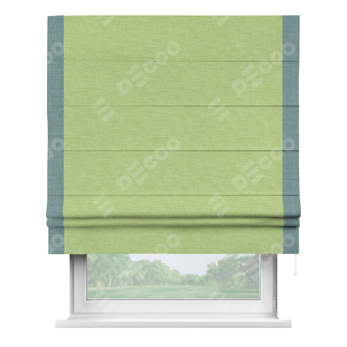Римская штора производителя «Cortin», используется для проёма, пошита из ткани лён зеленый, артикул 85906. Отделка шторы кантом «Стрим Дуо», ткань для канта используется из льна разной расцветки на выбор. Имеет универсальный механизм и подходит для монтажа: на потолок, на стену и в нишу.