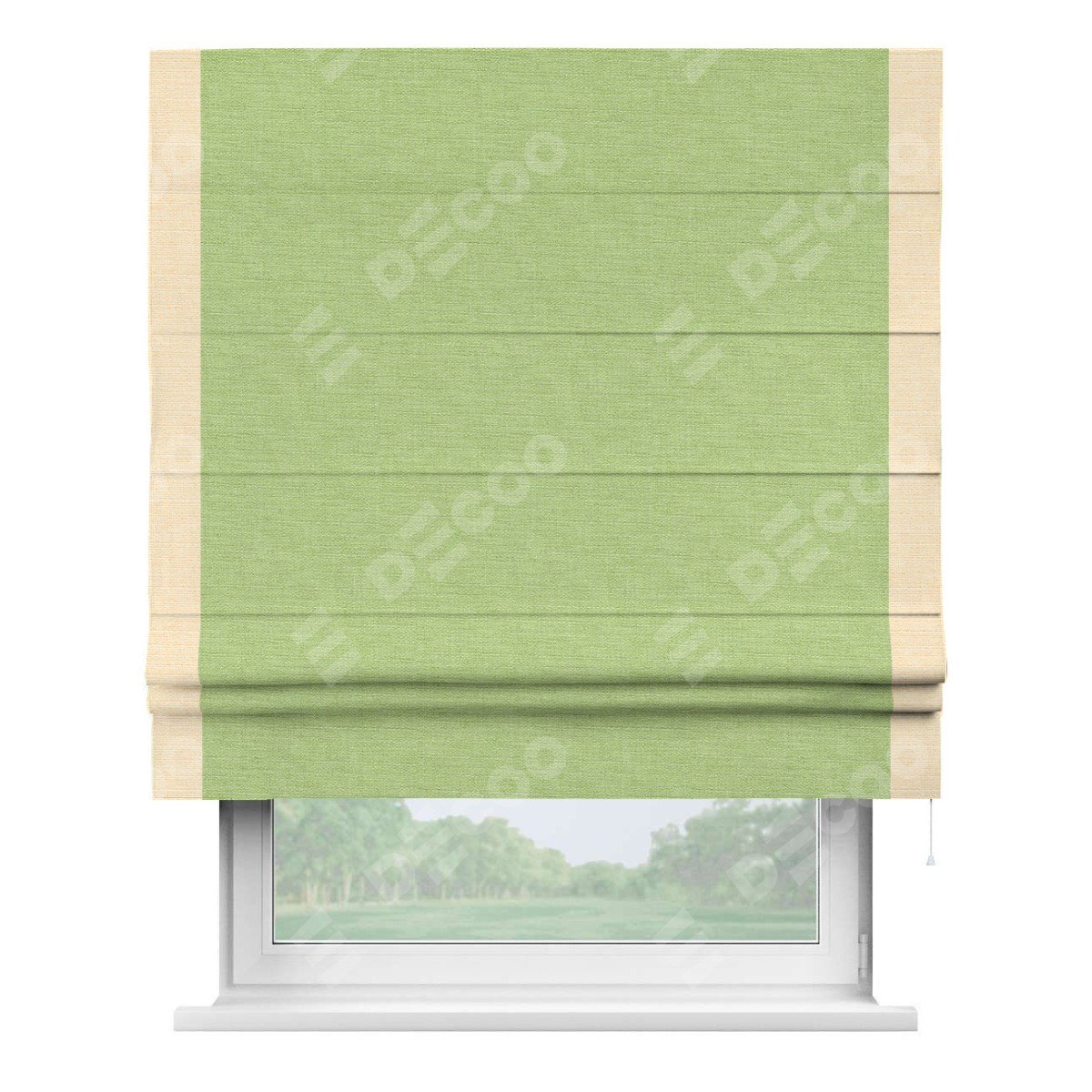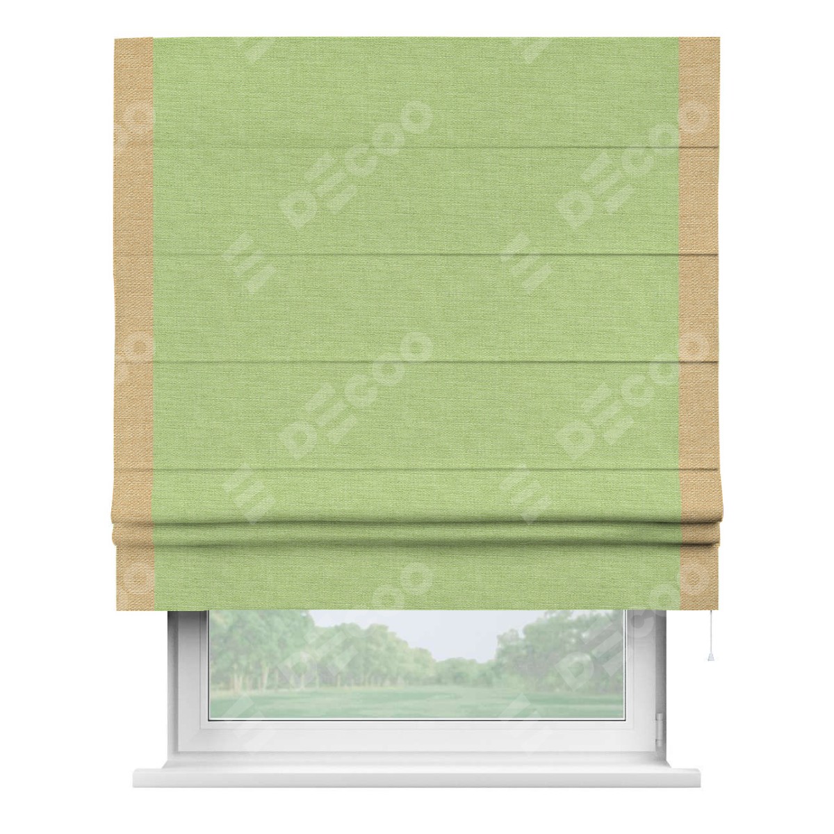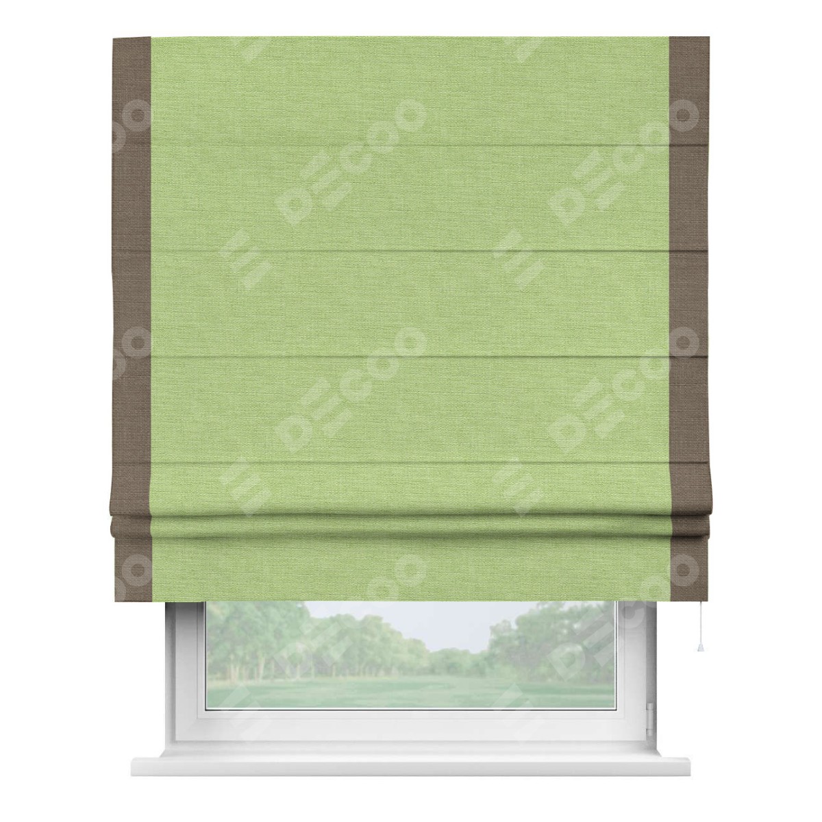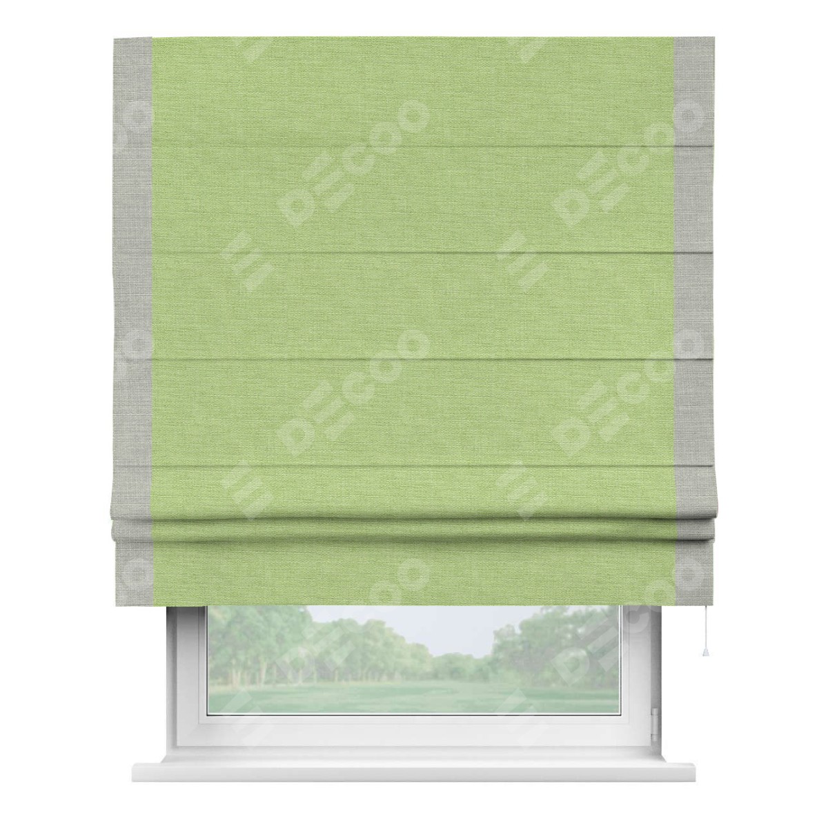 Римская штора производителя «Cortin», используется для проёма, пошита из ткани лён зеленый, артикул 85906. Отделка шторы кантом «Стрим Дуо», ткань для канта используется из льна разной расцветки на выбор. Имеет универсальный механизм и подходит для монтажа: на потолок, на стену и в нишу.