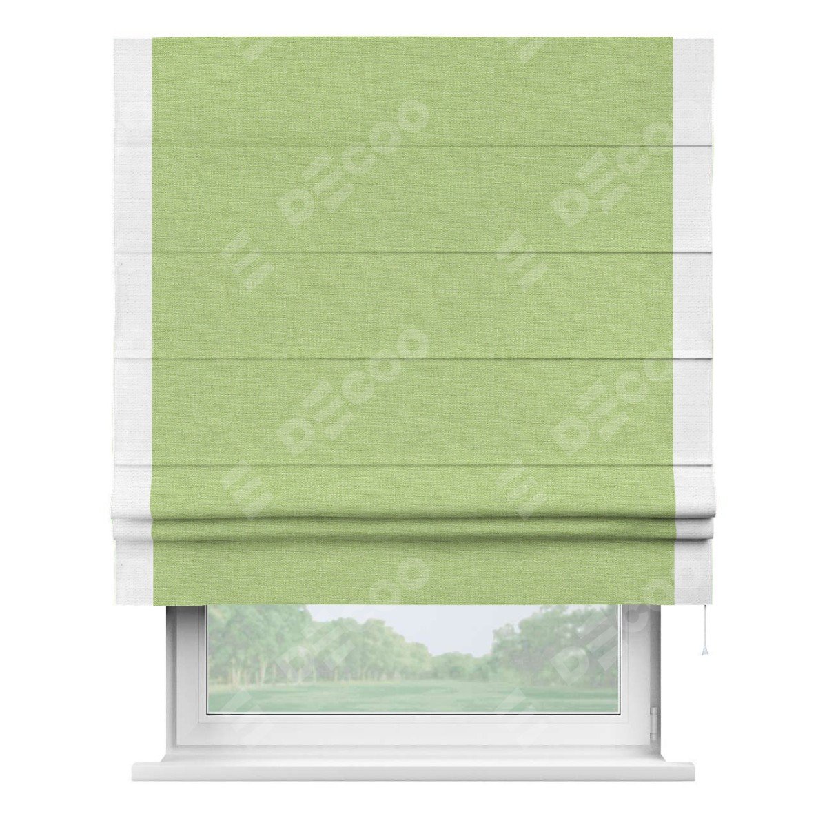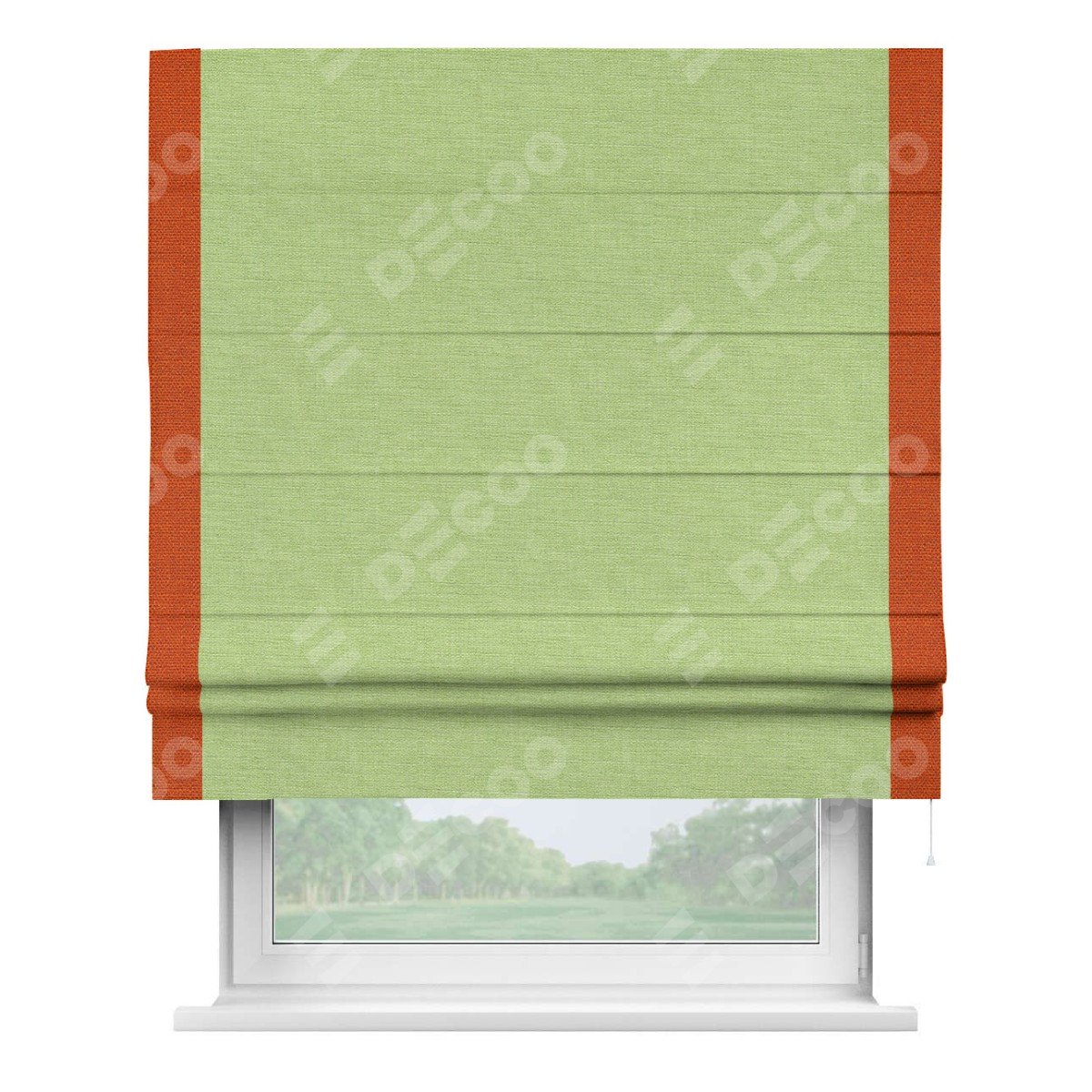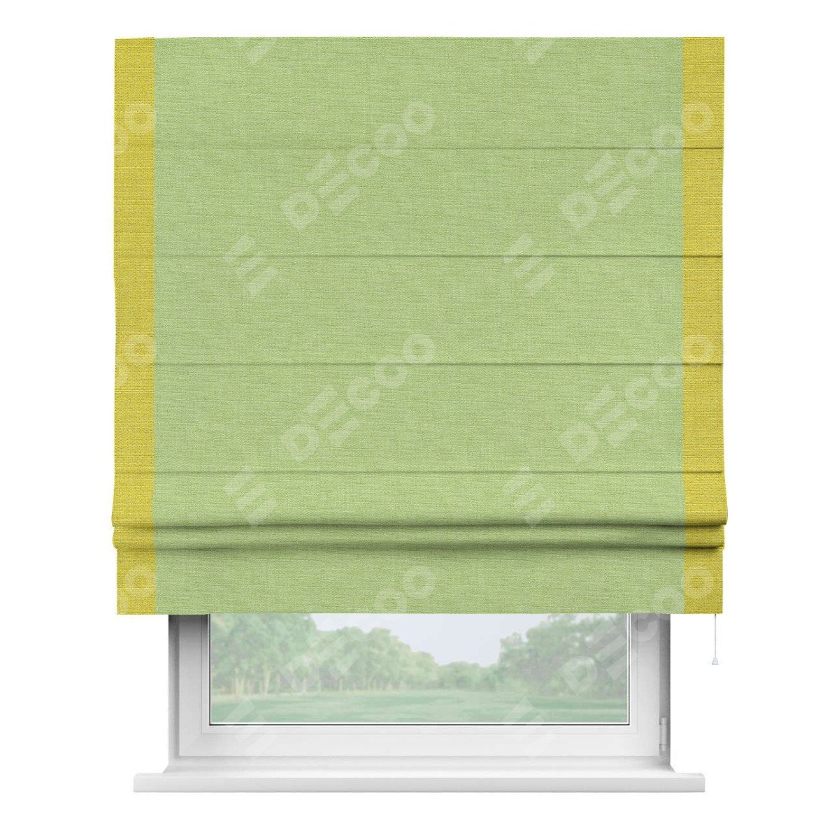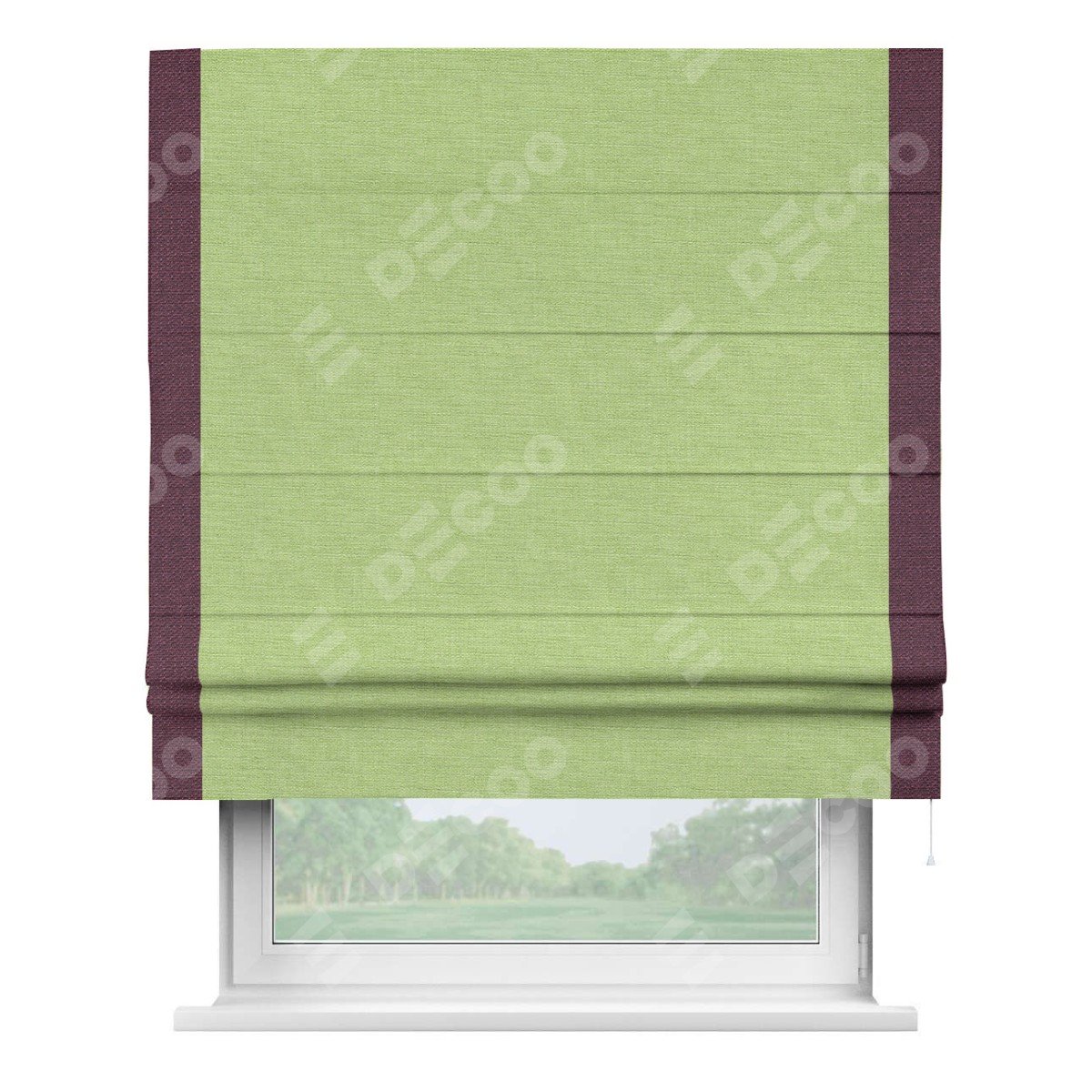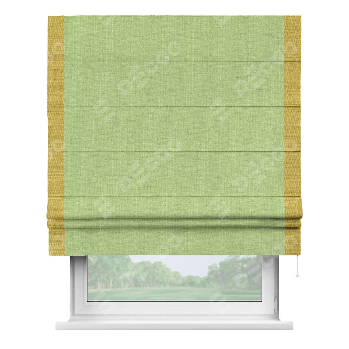 Римская штора производителя «Cortin», используется для проёма, пошита из ткани лён зеленый, артикул 85906. Отделка шторы кантом «Стрим Дуо», ткань для канта используется из льна разной расцветки на выбор. Имеет универсальный механизм и подходит для монтажа: на потолок, на стену и в нишу.