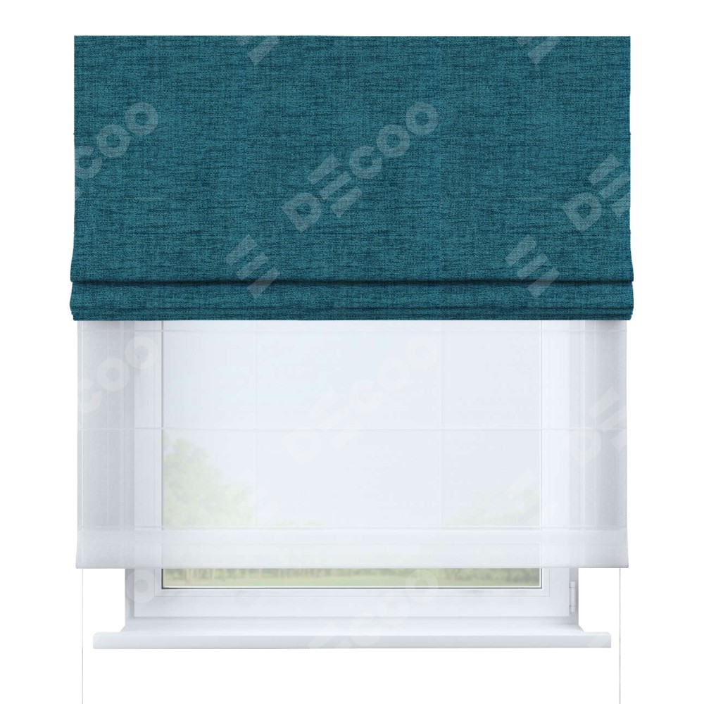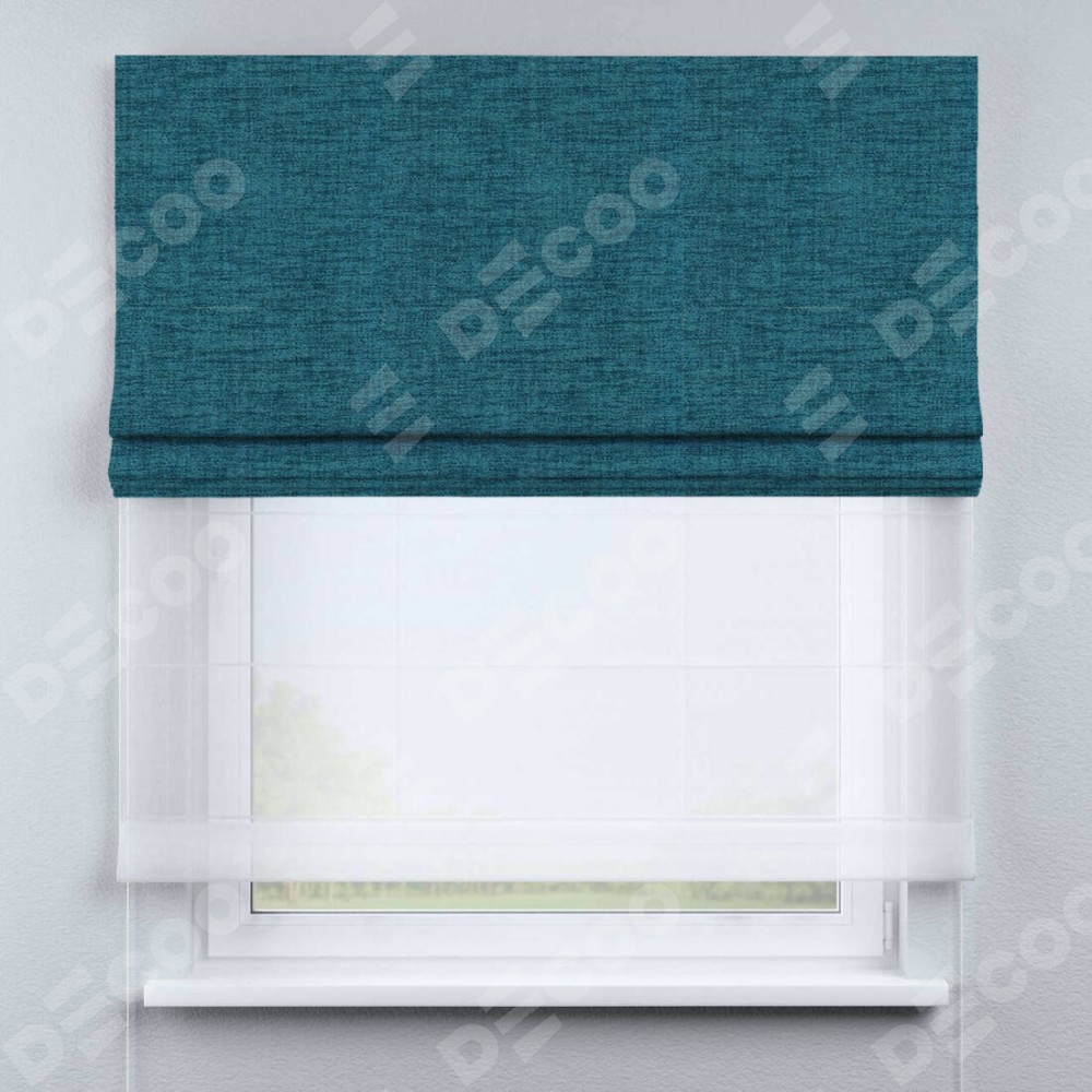 Римская штора день-ночь производителя «Cortin», используется для проёма, пошита из двух полотен, с лицевой стороны рогожка димаут синий артикул 80422, вторая ткань тюль (по стандарту комплектуется тюль белого цвета артикул V-01). Имеет универсальный механизм и подходит для монтажа: на потолок, на стену и в нишу.