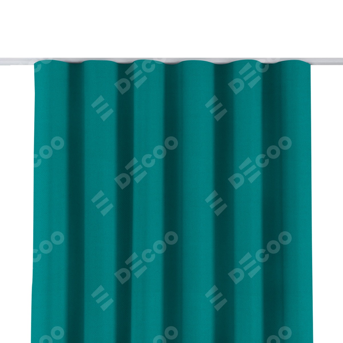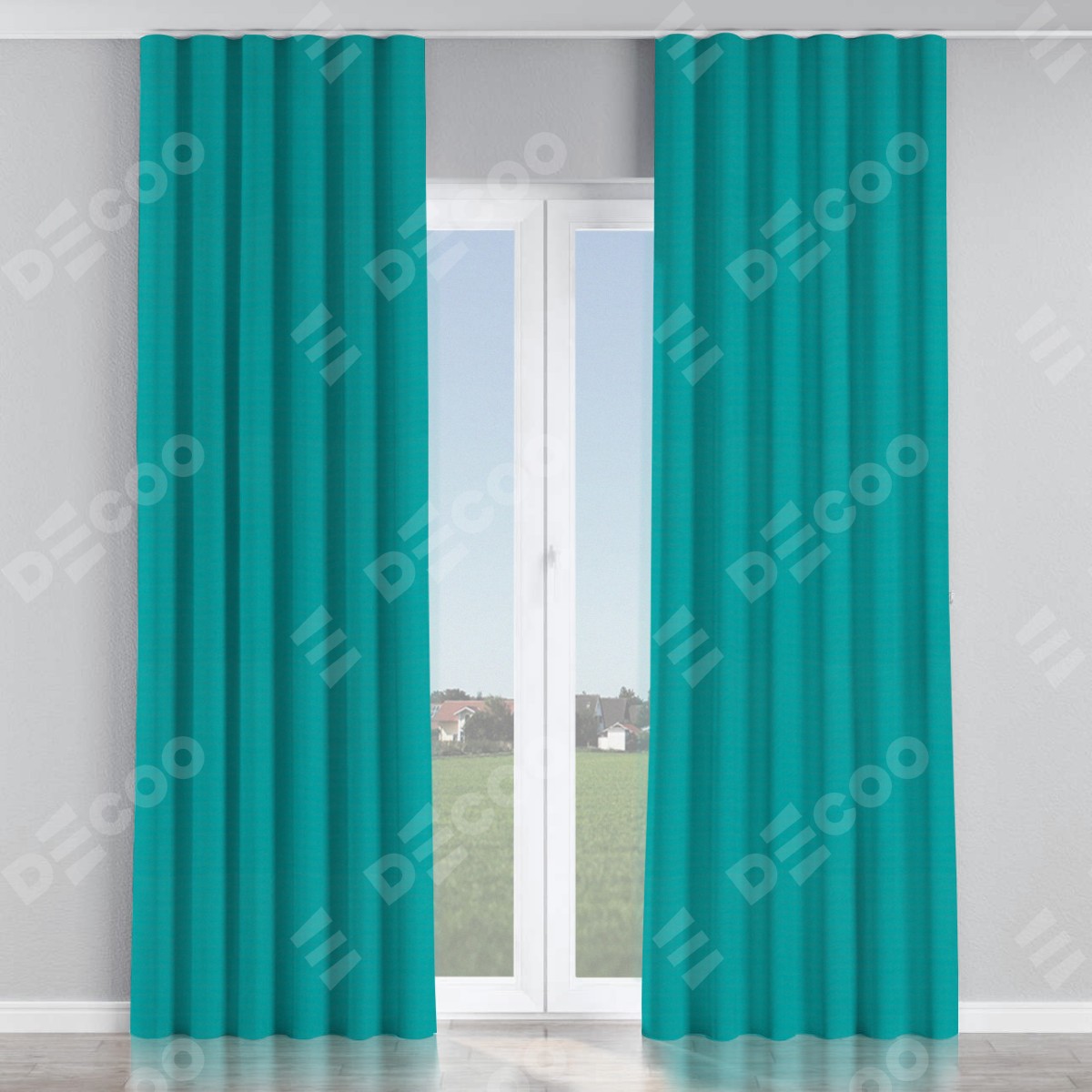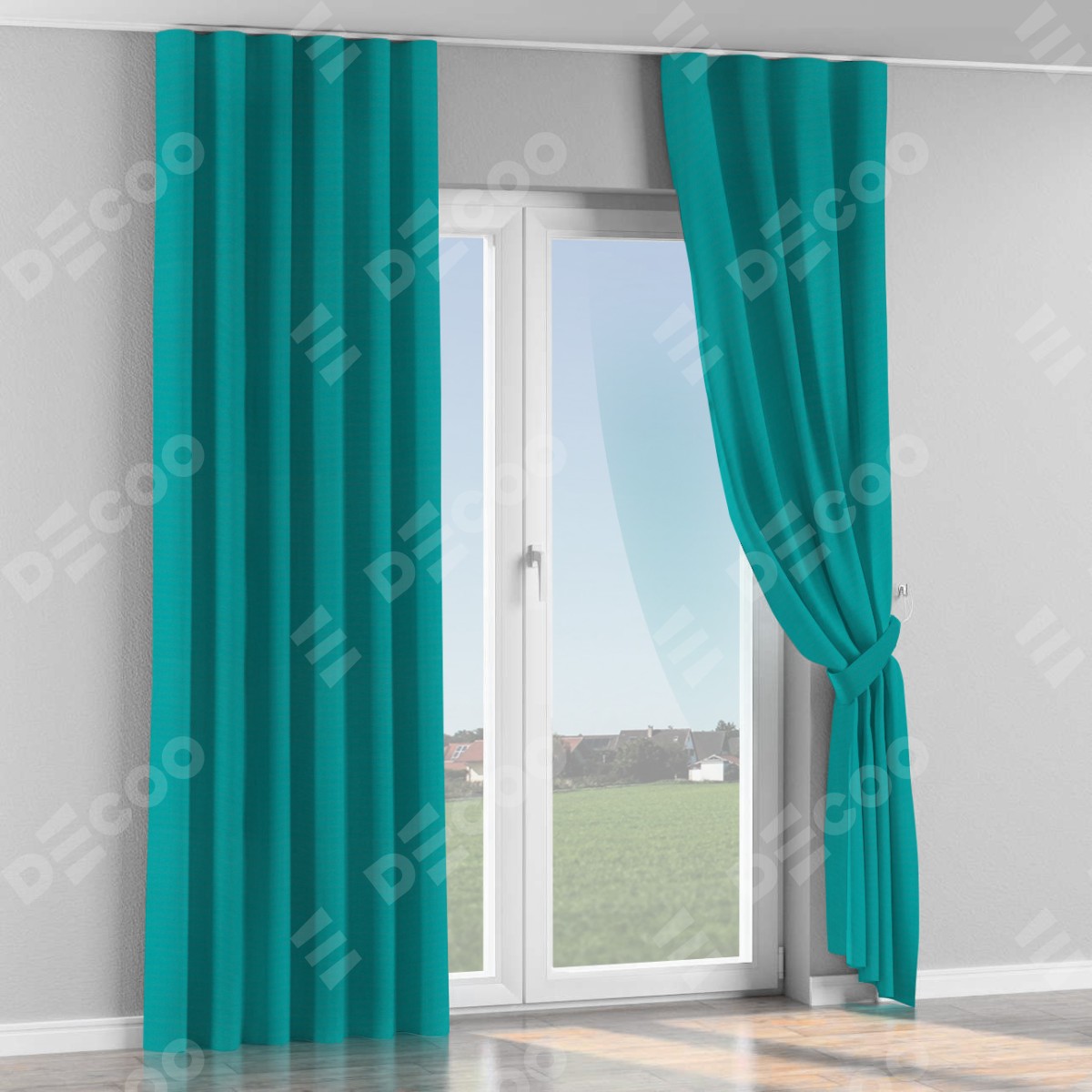 Комплект прямых штор, от производителя «Cortin», пошиты из ткани блэкаут однотонный бирюзовый, артикул ткани 88297. С изнаночной стороны в верхней части штор пристрачивается шторная лента с декоративными складками «Волна». Для создания элегантных складок прямые шторы шьются по стандарту с коэффициентом 1:2 (на 100 см. ширины проёма 200 см. ширины ткани).