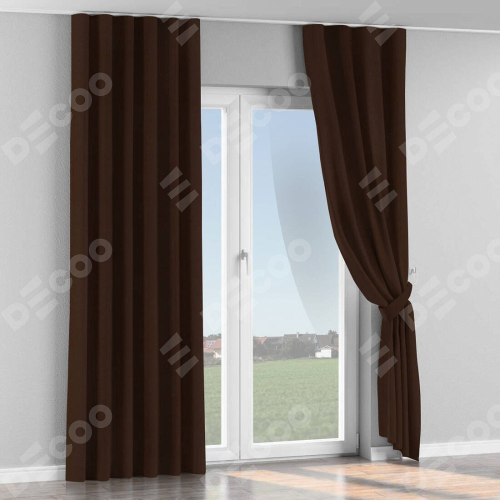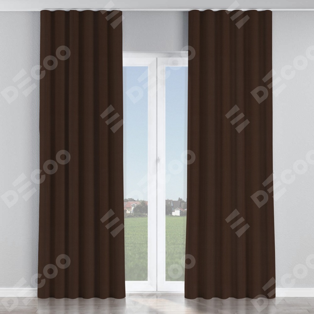 Комплект прямых штор, от производителя «Cortin», пошиты из ткани блэкаут однотонный тёмно-коричневый, артикул ткани 88287. С изнаночной стороны в верхней части штор пристрачивается шторная лента с декоративными складками «Волна». Для создания элегантных складок прямые шторы шьются по стандарту с коэффициентом 1:2 (на 100 см. ширины проёма 200 см. ширины ткани).
