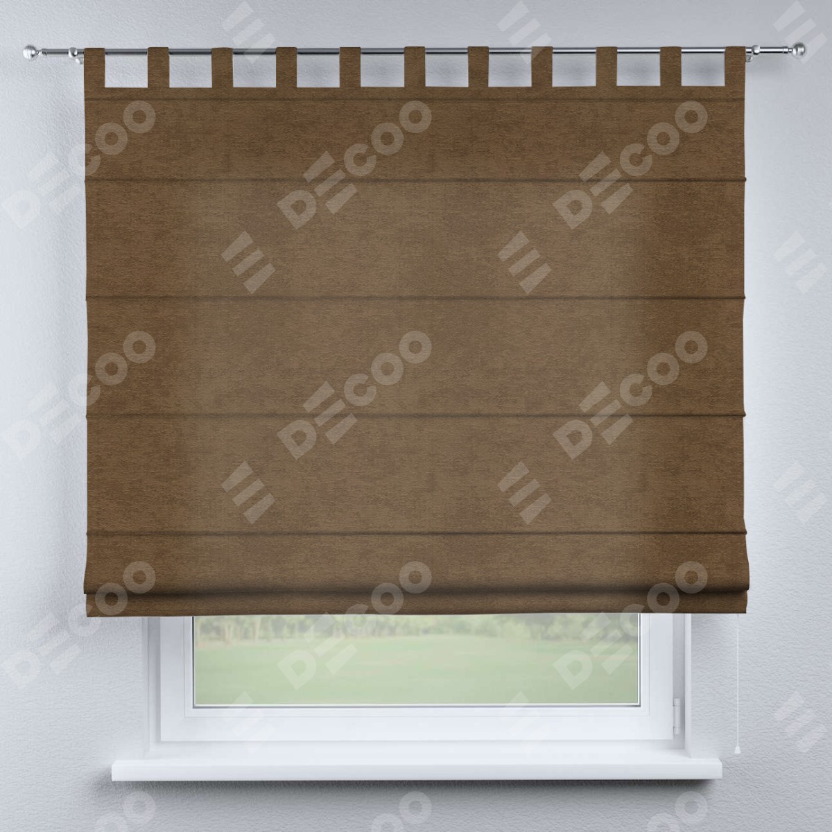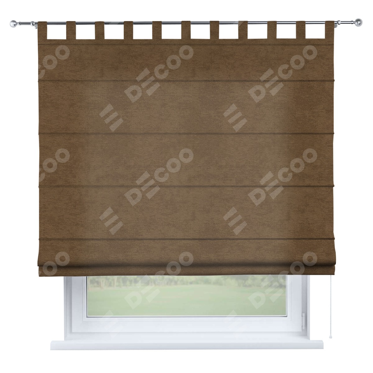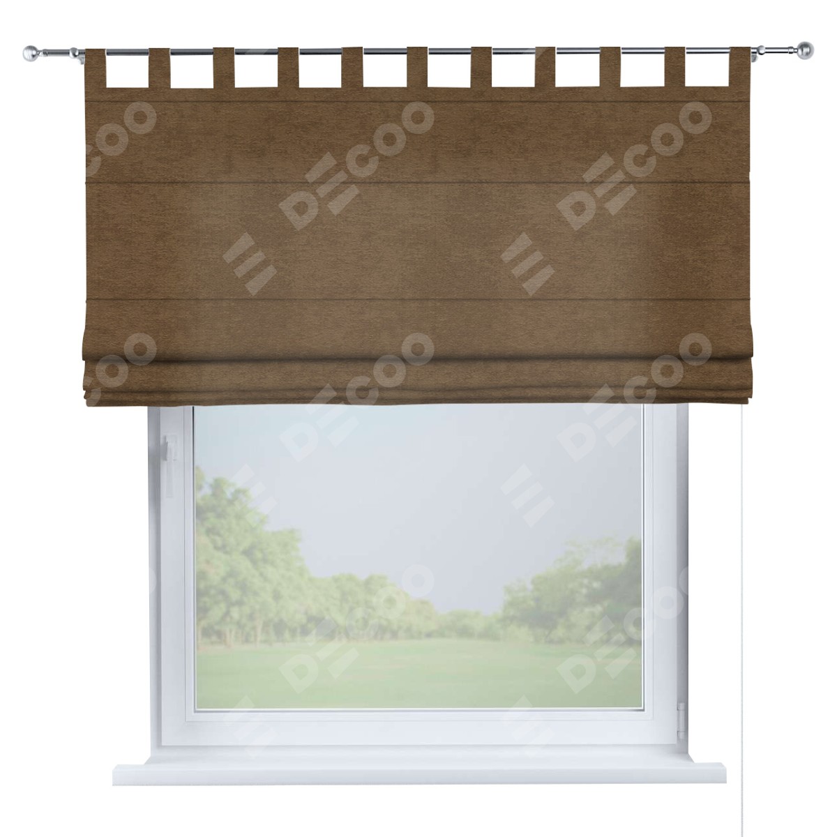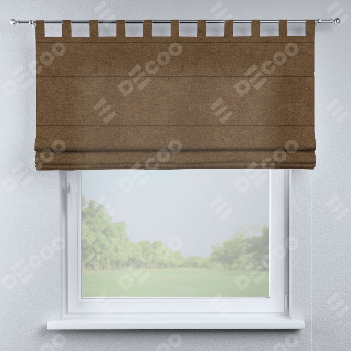 Римская штора производителя «Cortin», используется для проёма, пошита из ткани софт однотонный бронзовый, артикул ткани 33099. Данная модель пошита на петлях, комплектуется на выбор круглым карнизом и подходит для монтажа на стену. Римская штора на петлях имеет простую систему регулировки высоты, отличительным преимуществом данной модели является простой способ монтажа. Достаточно повесить ее на трубу и штора готова!