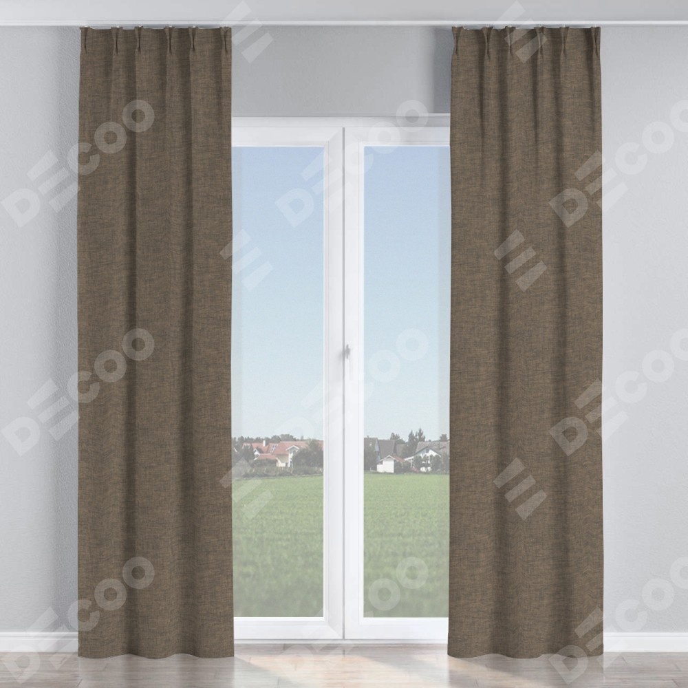 Комплект прямых штор, от производителя «Cortin», пошиты из ткани рогожка димаут коричневый, артикул ткани 80420. С изнаночной стороны в верхней части штор пристрачивается шторная лента с декоративными складками «Кустик». Для создания элегантных складок прямые шторы шьются по стандарту с коэффициентом 1:2 (на 100 см. ширины проёма 200 см. ширины ткани).