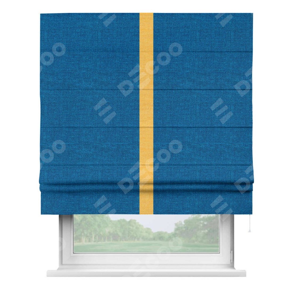 Римская штора производителя «Cortin», используется для проёма, пошита из ткани лён синий, артикул 63742. Отделка шторы кантом «Хайвэй», ткань для канта используется из льна разной расцветки на выбор. Имеет универсальный механизм и подходит для монтажа: на потолок, на стену и в нишу.