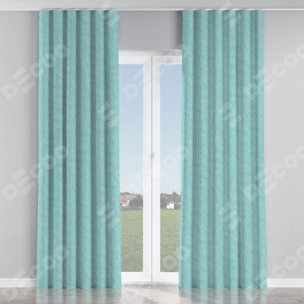Комплект прямых штор, от производителя «Cortin», пошиты из ткани лён димаут бирюзовый, артикул ткани 23. С изнаночной стороны в верхней части штор пристрачивается шторная лента с декоративными складками «Волна». Для создания элегантных складок прямые шторы шьются по стандарту с коэффициентом 1:2 (на 100 см. ширины проёма 200 см. ширины ткани).