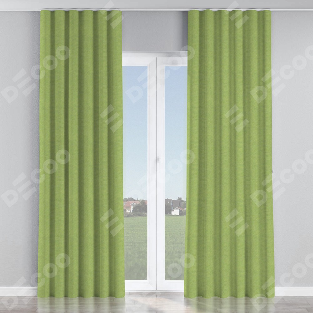 Комплект прямых штор, от производителя «Cortin», пошиты из ткани лён димаут салатовый, артикул ткани 83032. С изнаночной стороны в верхней части штор пристрачивается шторная лента с декоративными складками «Волна». Для создания элегантных складок прямые шторы шьются по стандарту с коэффициентом 1:2 (на 100 см. ширины проёма 200 см. ширины ткани).