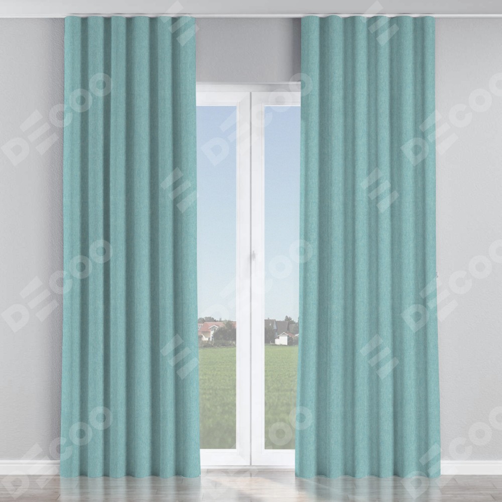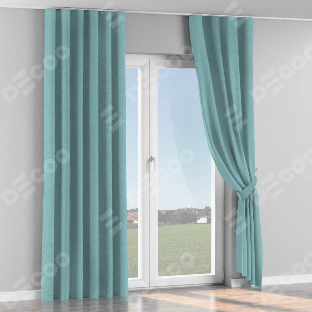 Комплект прямых штор, от производителя «Cortin», пошиты из ткани твид блэкаут небесно-голубой, артикул ткани 21578. С изнаночной стороны в верхней части штор пристрачивается шторная лента с декоративными складками «Волна». Для создания элегантных складок прямые шторы шьются по стандарту с коэффициентом 1:2 (на 100 см. ширины проёма 200 см. ширины ткани).