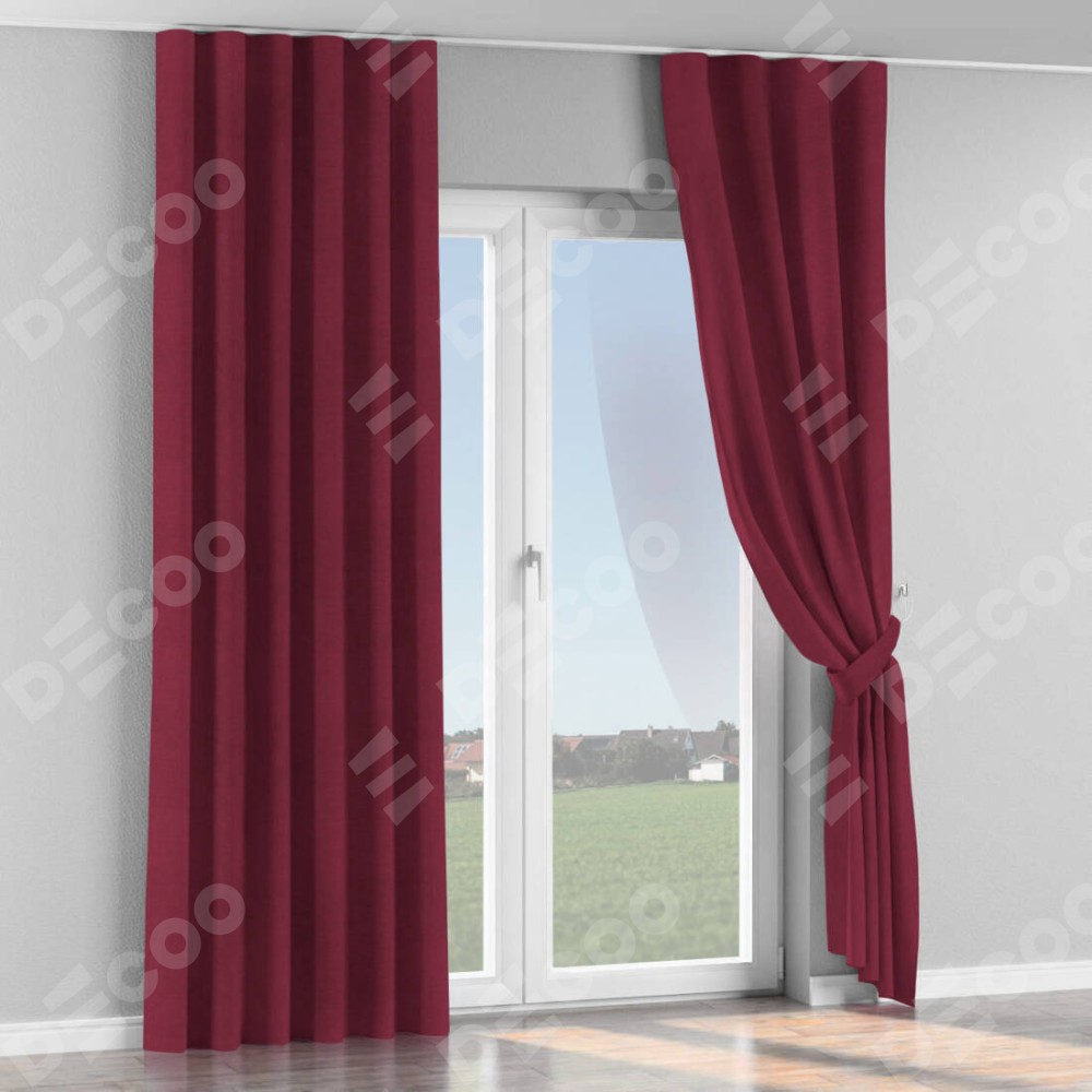 Комплект прямых штор, от производителя «Cortin», пошиты из ткани вельвет бордовый, артикул ткани 85553. С изнаночной стороны в верхней части штор пристрачивается шторная лента с декоративными складками «Волна». Для создания элегантных складок прямые шторы шьются по стандарту с коэффициентом 1:2 (на 100 см. ширины проёма 200 см. ширины ткани).