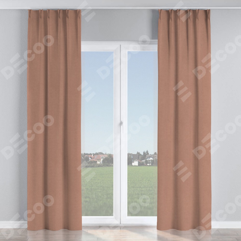 Комплект прямых штор, от производителя «Cortin», пошиты из ткани вельвет брусничный джем, артикул ткани 17750. С изнаночной стороны в верхней части штор пристрачивается шторная лента с декоративными складками «Кустик». Для создания элегантных складок прямые шторы шьются по стандарту с коэффициентом 1:2 (на 100 см. ширины проёма 200 см. ширины ткани).