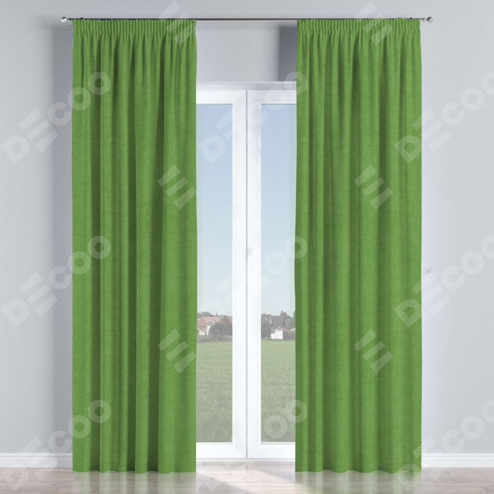 Комплект прямых штор, от производителя «Cortin», пошиты из ткани вельвет салатовый, артикул ткани 87072. С изнаночной стороны в верхней части штор пристрачивается шторная лента с декоративными складками «Карандаш». Для создания элегантных складок прямые шторы шьются по стандарту с коэффициентом 1:2 (на 100 см. ширины проёма 200 см. ширины ткани).