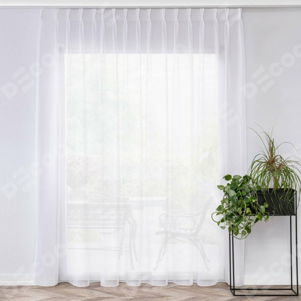 Комплект прямых штор, от производителя «Cortin», пошиты из ткани тюль белый, артикул ткани V-01. С изнаночной стороны в верхней части штор пристрачивается шторная лента с декоративными складками «Кустик». Для создания элегантных складок прямые шторы шьются по стандарту с коэффициентом 1:2 (на 100 см. ширины проёма 200 см. ширины ткани).