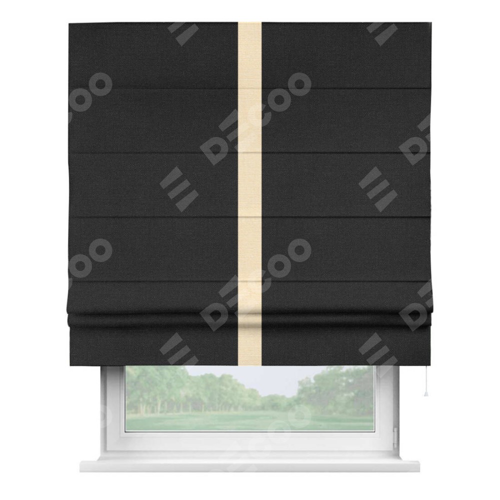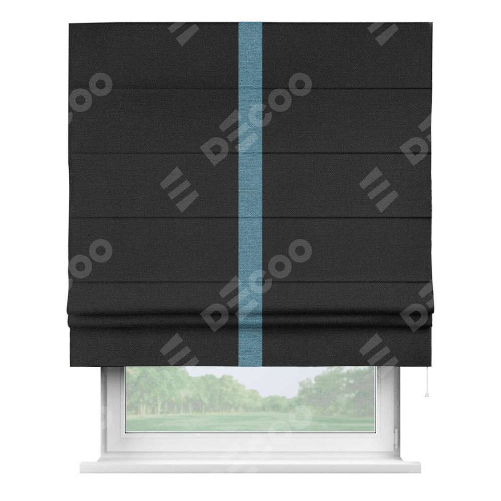 Римская штора производителя «Cortin», используется для проёма, пошита из ткани лён черный, артикул 85927. Отделка шторы кантом «Хайвэй», ткань для канта используется из льна разной расцветки на выбор. Имеет универсальный механизм и подходит для монтажа: на потолок, на стену и в нишу.