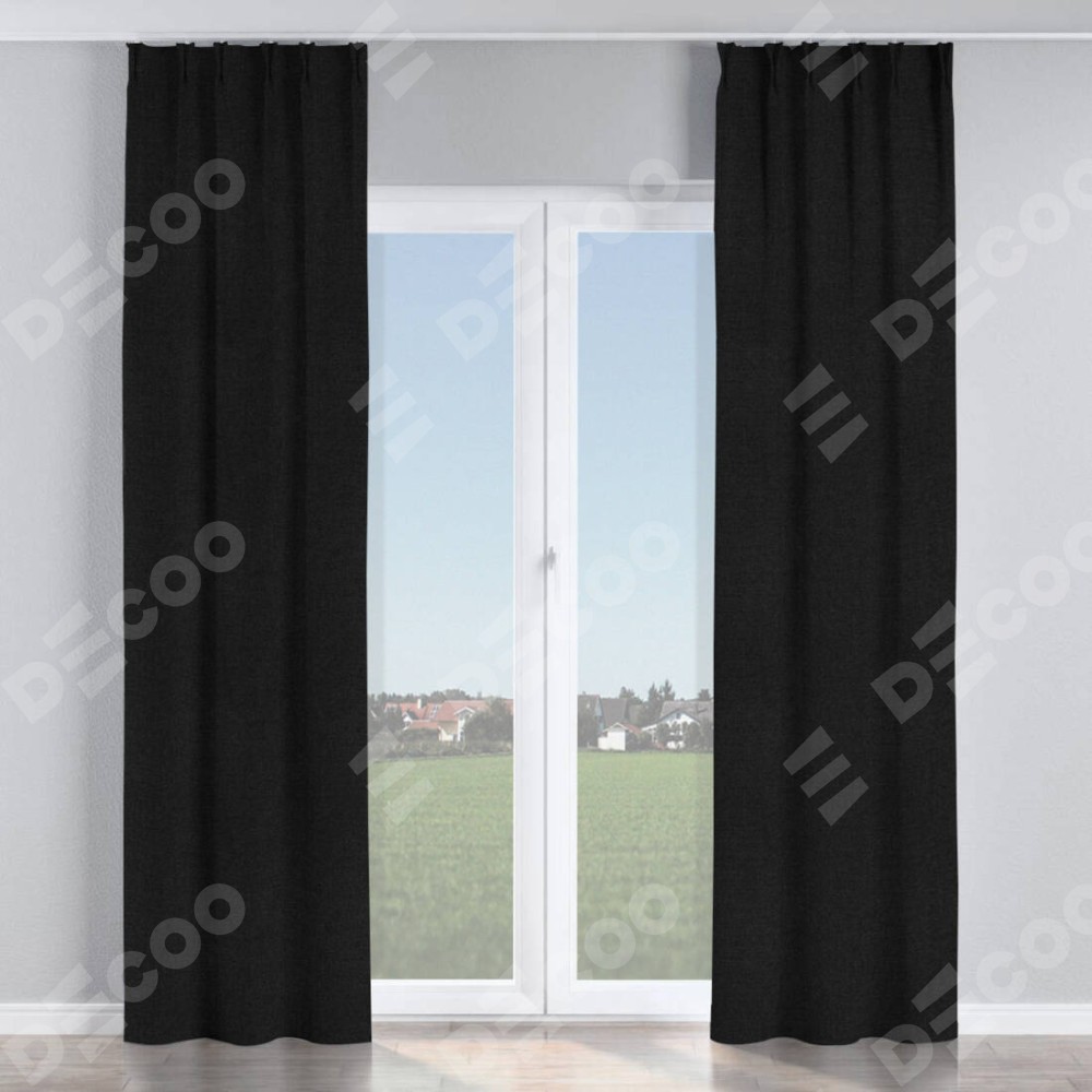 Комплект прямых штор, от производителя «Cortin», пошиты из ткани лён черный, артикул ткани 85927. С изнаночной стороны в верхней части штор пристрачивается шторная лента с декоративными складками «Кустик». Для создания элегантных складок прямые шторы шьются по стандарту с коэффициентом 1:2 (на 100 см. ширины проёма 200 см. ширины ткани).