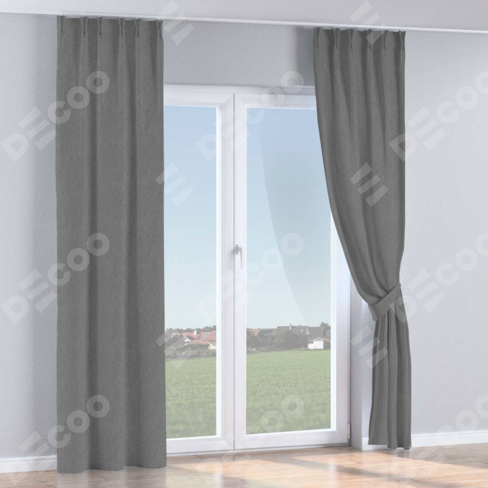 Комплект прямых штор, от производителя «Cortin», пошиты из ткани софт однотонный серый, артикул ткани 70605. С изнаночной стороны в верхней части штор пристрачивается шторная лента с декоративными складками «Кустик». Для создания элегантных складок прямые шторы шьются по стандарту с коэффициентом 1:2 (на 100 см. ширины проёма 200 см. ширины ткани).