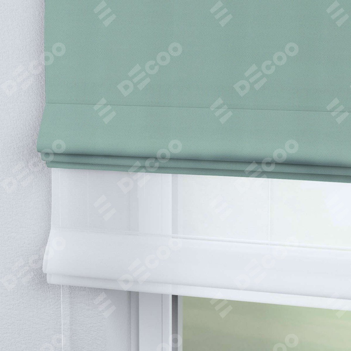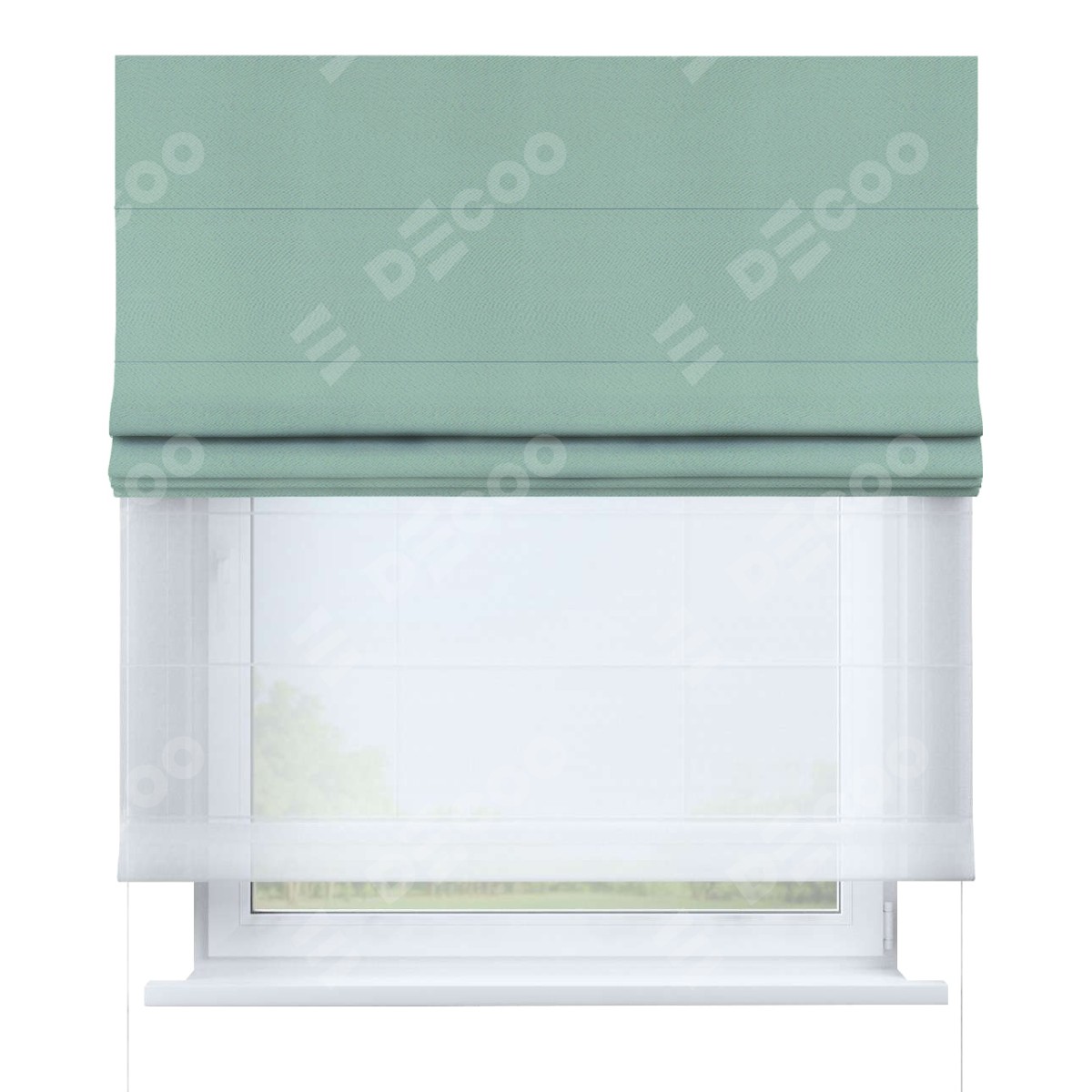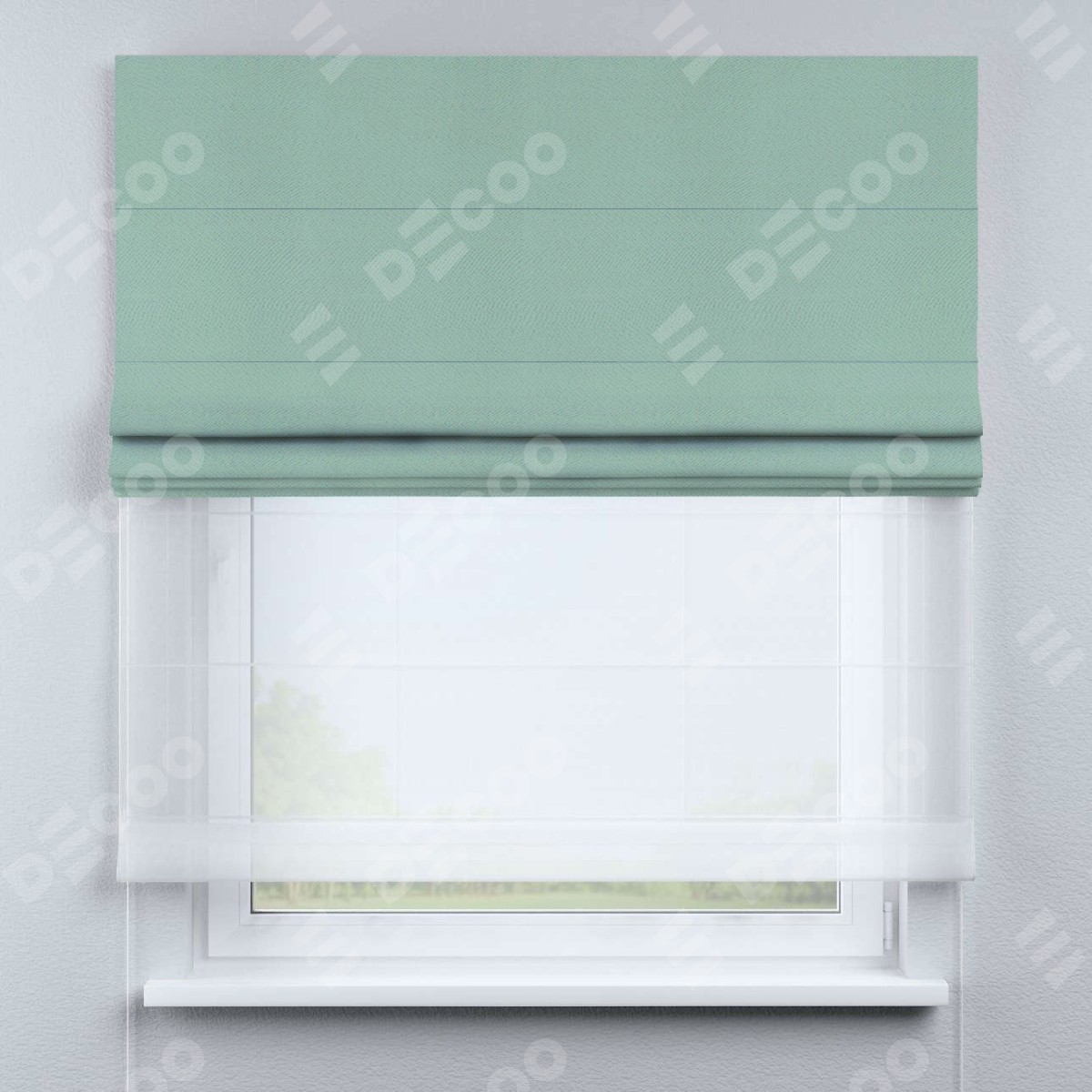 Римская штора день-ночь производителя «Cortin», используется для проёма, пошита из двух полотен, с лицевой стороны блэкаут однотонный ментоловый артикул 29584, вторая ткань тюль (по стандарту комплектуется тюль белого цвета артикул V-01). Имеет универсальный механизм и подходит для монтажа: на потолок, на стену и в нишу.