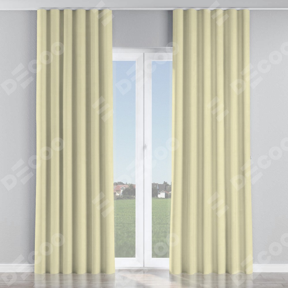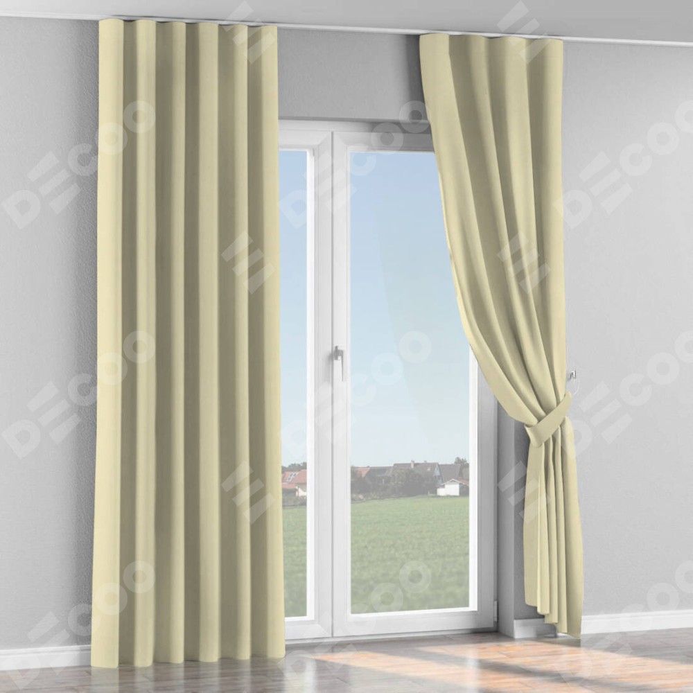 Комплект прямых штор, от производителя «Cortin», пошиты из ткани блэкаут однотонный бежевый, артикул ткани 88283. С изнаночной стороны в верхней части штор пристрачивается шторная лента с декоративными складками «Волна». Для создания элегантных складок прямые шторы шьются по стандарту с коэффициентом 1:2 (на 100 см. ширины проёма 200 см. ширины ткани).