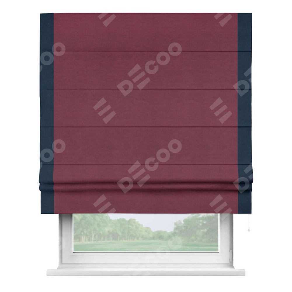 Римская штора производителя «Cortin», используется для проёма, пошита из ткани вельвет бордовый, артикул ткани 85553. Отделка шторы кантом «Стрим Дуо», ткань для канта используется из вельвета разной расцветки на выбор. Имеет универсальный механизм и подходит для монтажа: на потолок, на стену и в нишу.
