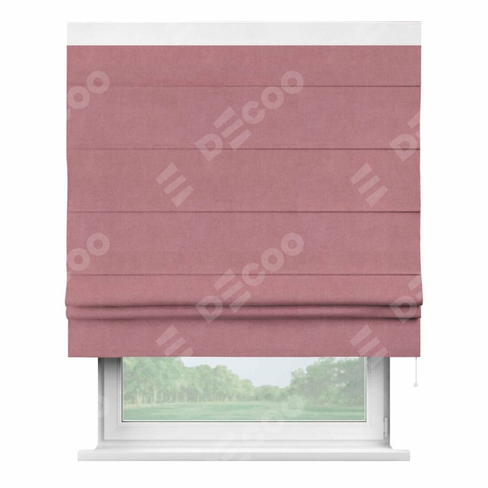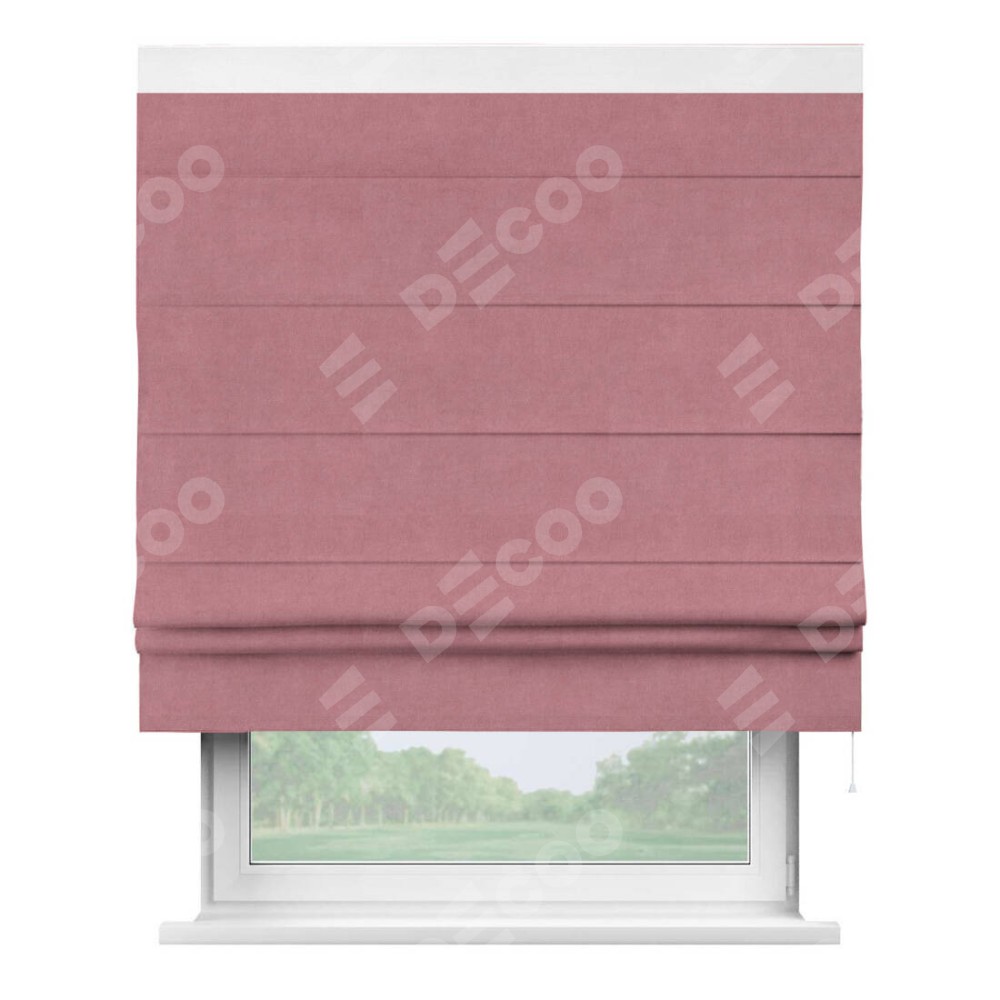 Римская штора производителя «Cortin», используется для проёма, пошита из ткани вельвет брусника, артикул ткани 85550. Отделка шторы кантом «Кинг», ткань для канта используется из вельвета разной расцветки на выбор. Имеет универсальный механизм и подходит для монтажа: на потолок, на стену и в нишу.