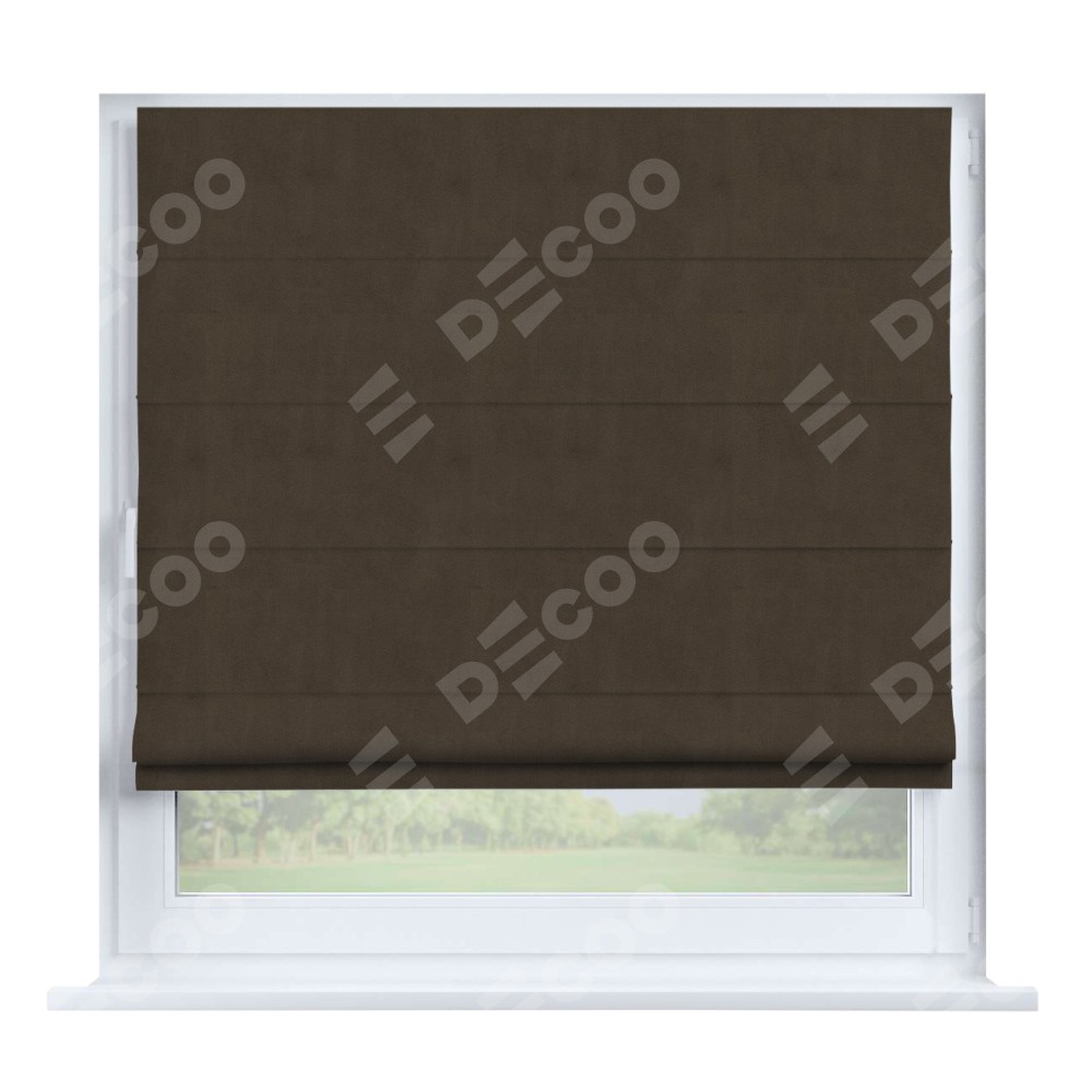 Римская штора производителя «Cortin», устанавливается на створку окна, пошита из ткани бархат тёмно-коричневый, артикул 5017. Штора шьётся по индивидуальным размерам, для данного типа римской шторы возможная ширина от 35 до 150 см., высота до 250 см.