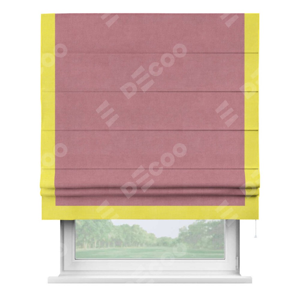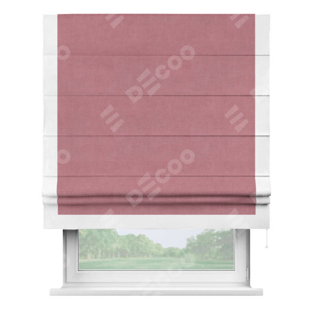 Римская штора производителя «Cortin», используется для проёма, пошита из ткани вельвет брусника, артикул ткани 85550. Отделка шторы кантом «Виктория», ткань для канта используется из вельвета разной расцветки на выбор. Имеет универсальный механизм и подходит для монтажа: на потолок, на стену и в нишу.