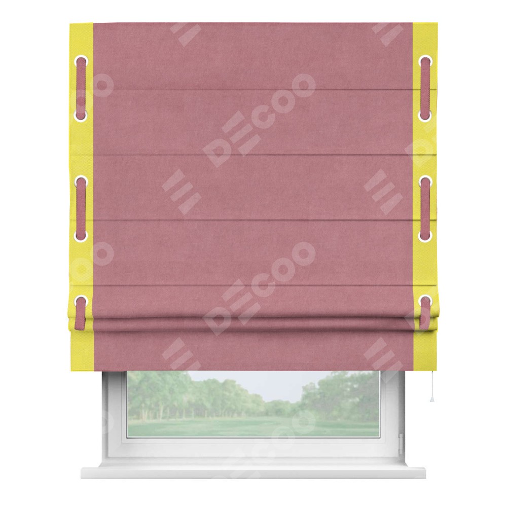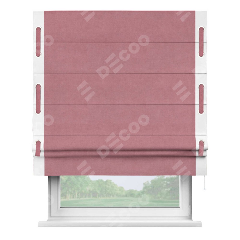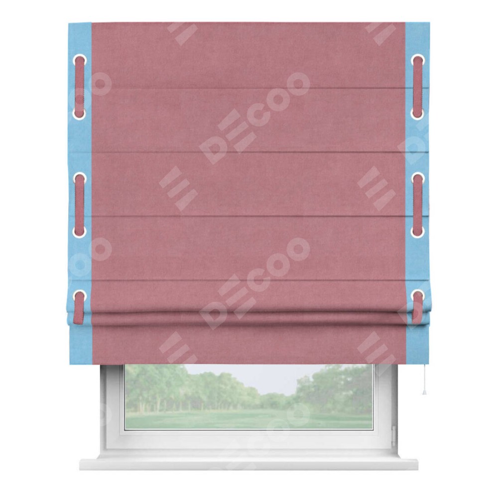 Римская штора производителя «Cortin», используется для проёма, пошита из ткани вельвет брусника, артикул ткани 85550. Отделка шторы кантом «Стрим Дуо» на кантах расположены люверсы с пояском, ткань для канта используется из вельвета разной расцветки на выбор. Ткань для пояска обычно используется из основной ткани шторы, а так же можно сделать из любой расцветки по желанию. Имеет универсальный механизм и подходит для монтажа: на потолок, на стену и в нишу.