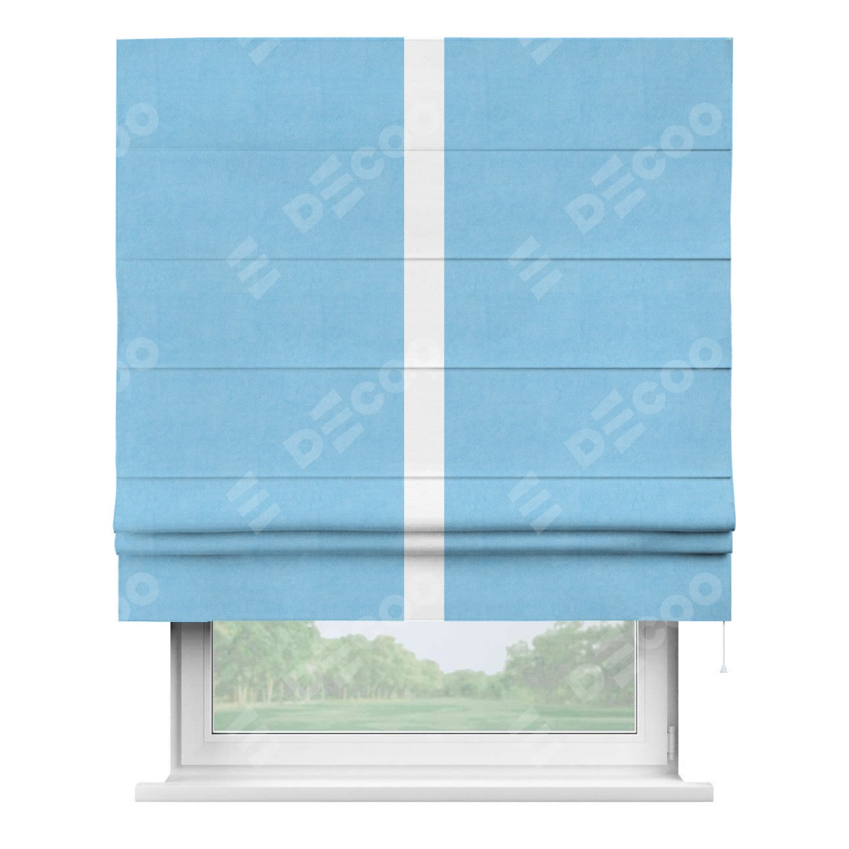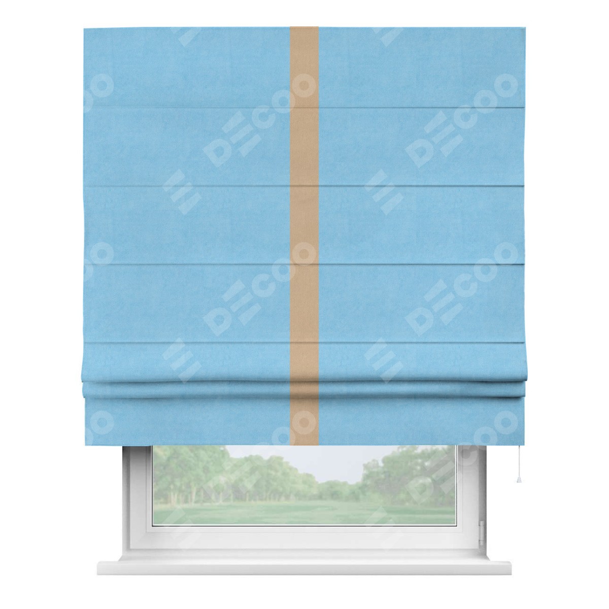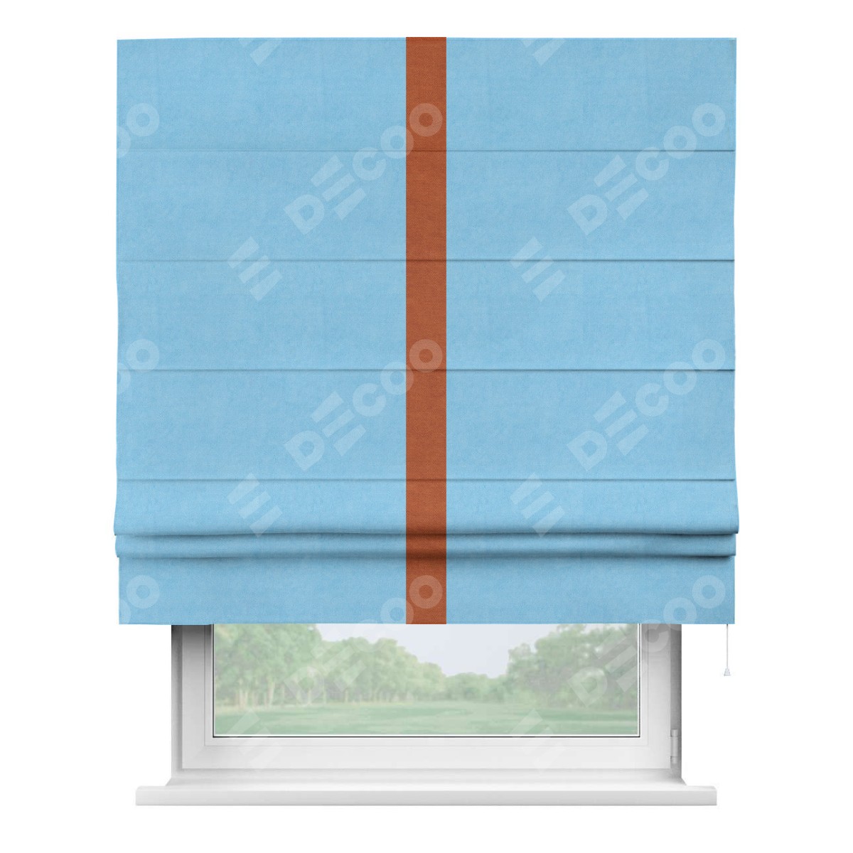 Римская штора производителя «Cortin», используется для проёма, пошита из ткани вельвет голубой, артикул ткани 85544. Отделка шторы кантом «Хайвей», ткань для канта используется из вельвета разной расцветки на выбор. Имеет универсальный механизм и подходит для монтажа: на потолок, на стену и в нишу.
