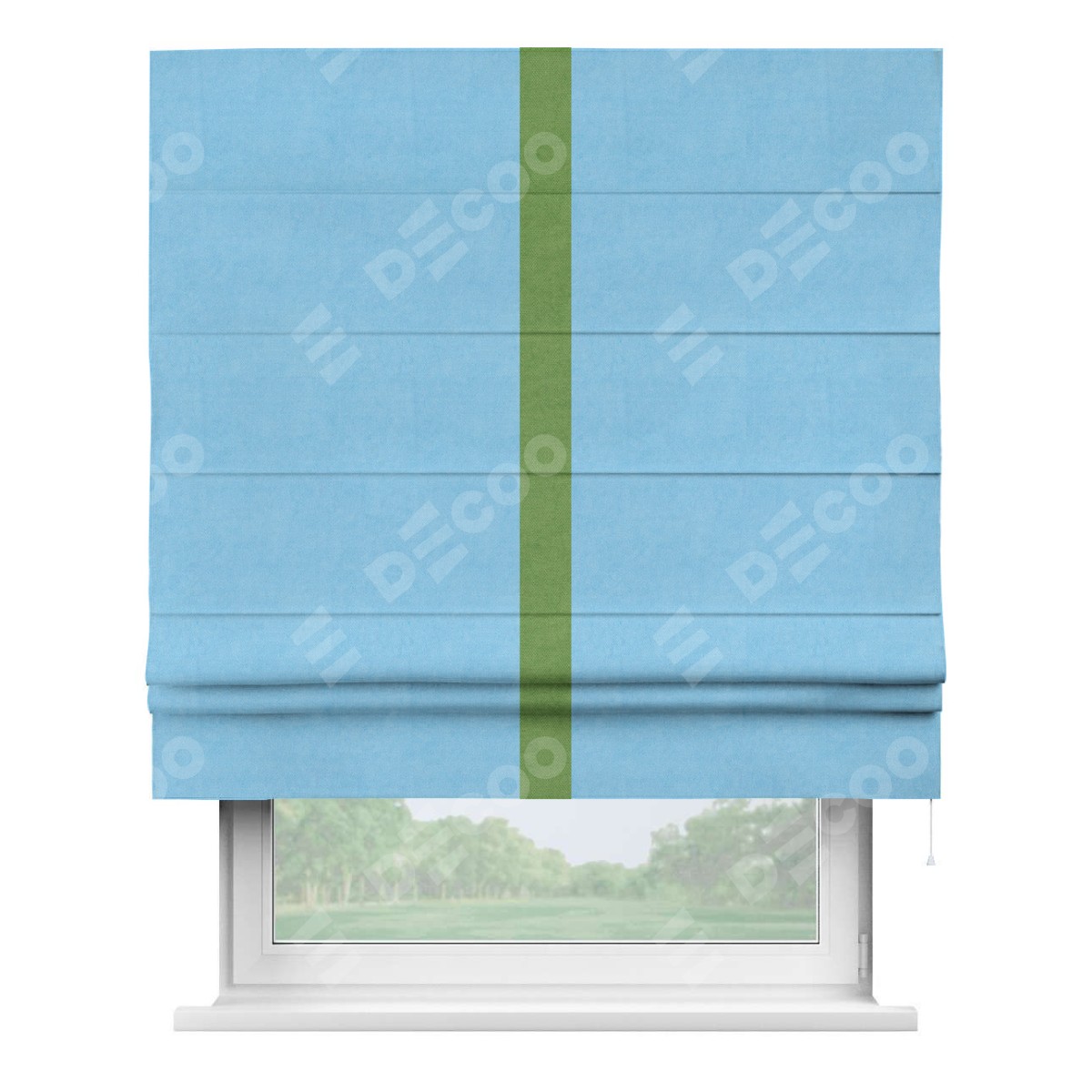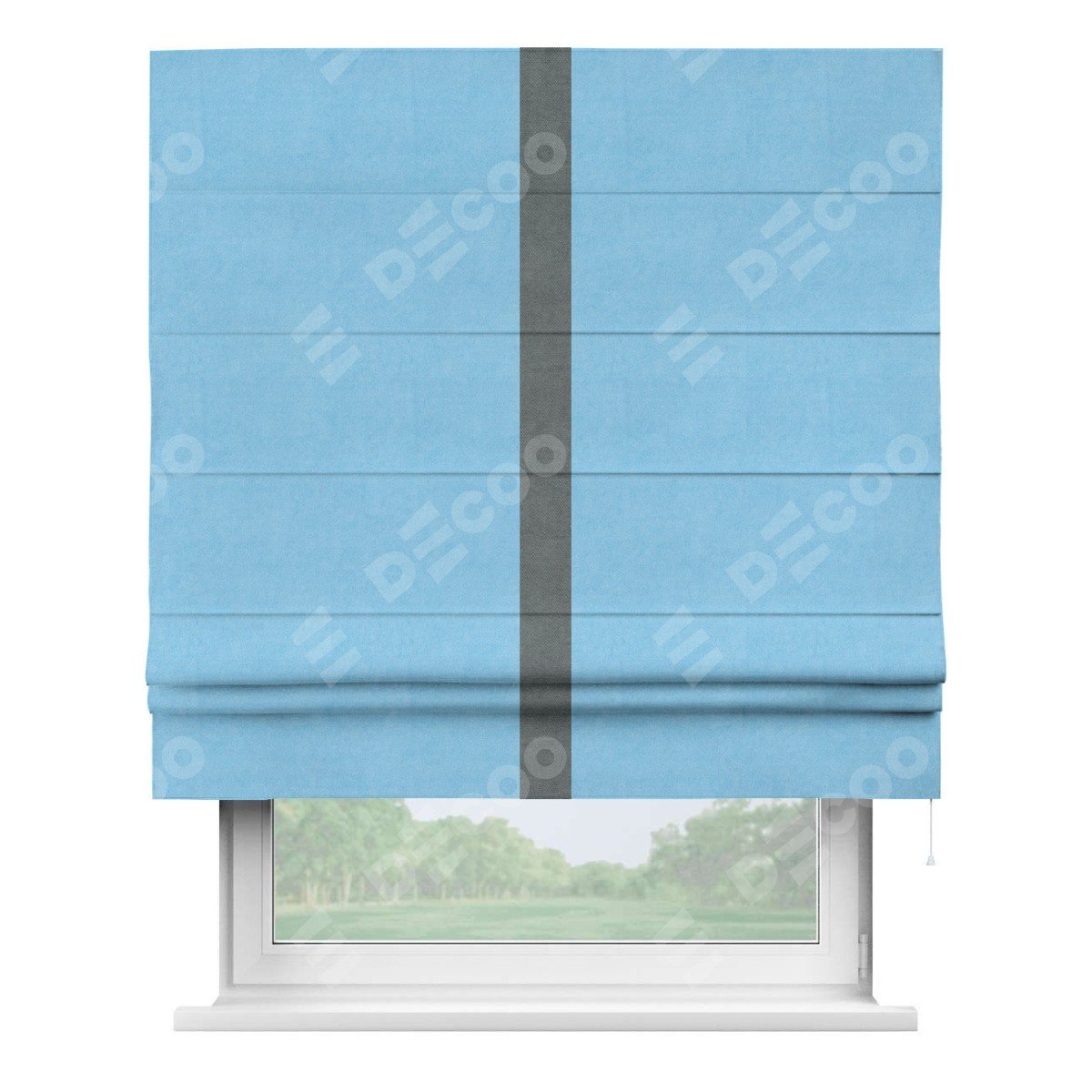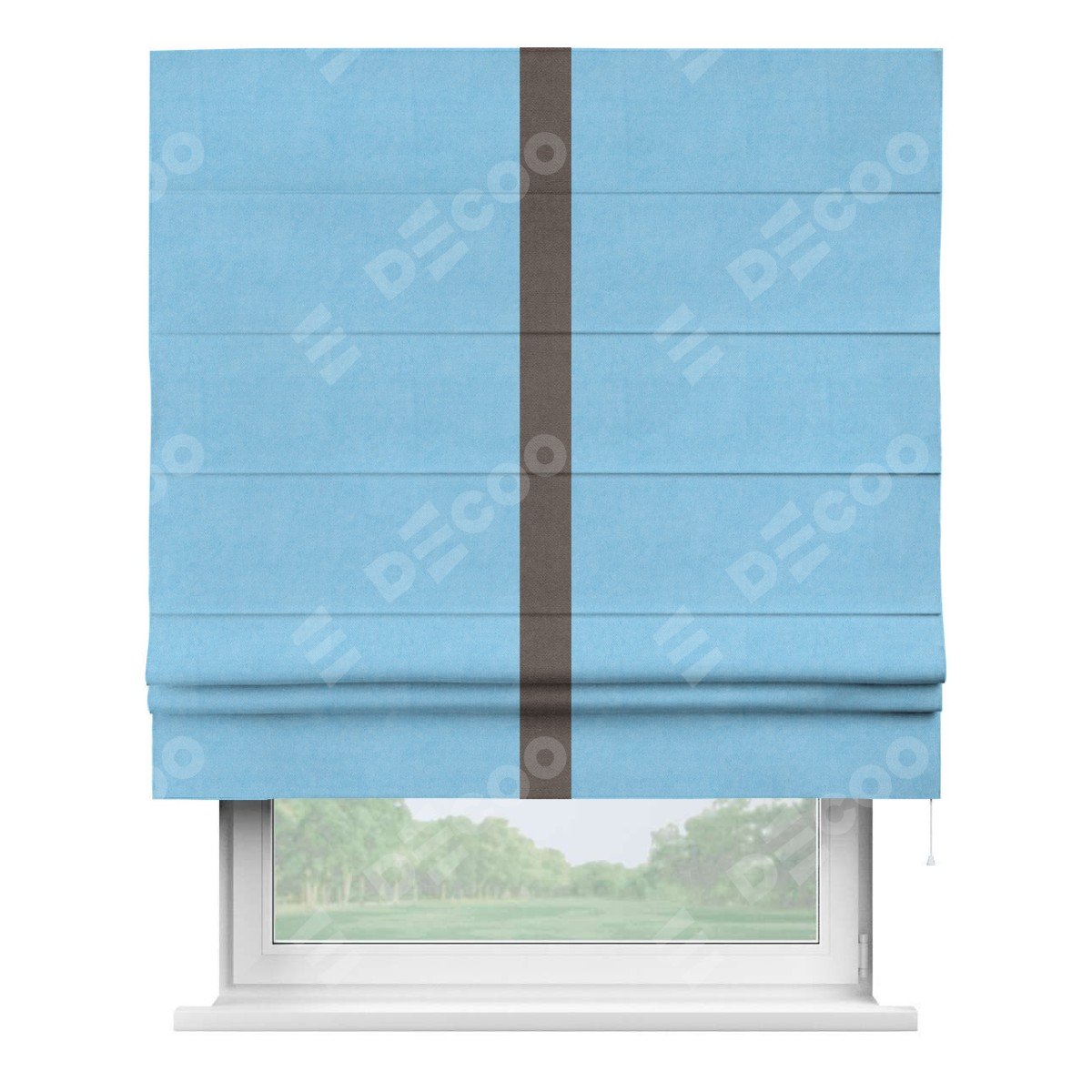 Римская штора производителя «Cortin», используется для проёма, пошита из ткани вельвет голубой, артикул ткани 85544. Отделка шторы кантом «Хайвей», ткань для канта используется из вельвета разной расцветки на выбор. Имеет универсальный механизм и подходит для монтажа: на потолок, на стену и в нишу.